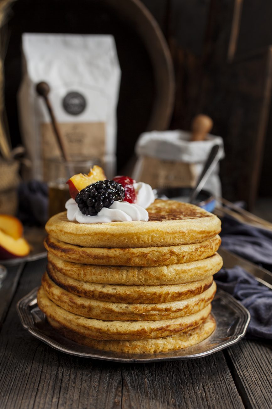 останалите продукти до хомогенност и разбърквайки с шпатула.Добавете разбитите белтъци. Загрейте тиган с диаметър около 12-13 см на умерено силен огън. Когато загрее сложете парченце масло с големината на лешник. Сипете от сместа, така че да покрие дъното с дебелина 3-4 мм. Печете около 1 мин или като видите, че повърхността се е изпълнила с характерните дупчици и не се забеляза съвсем сурова смес, обърнете и опечете още 30-40 сек.