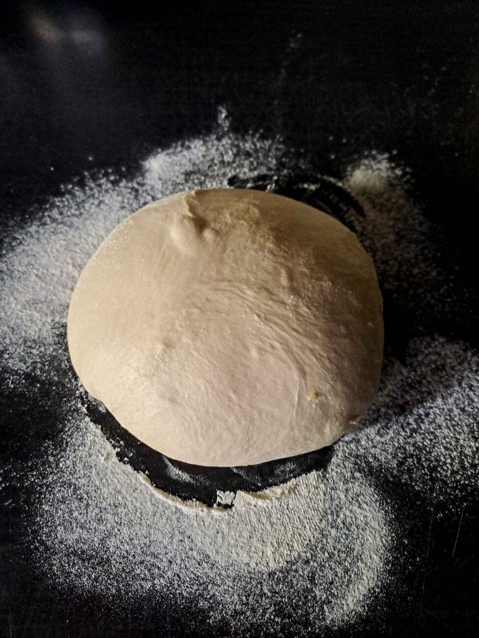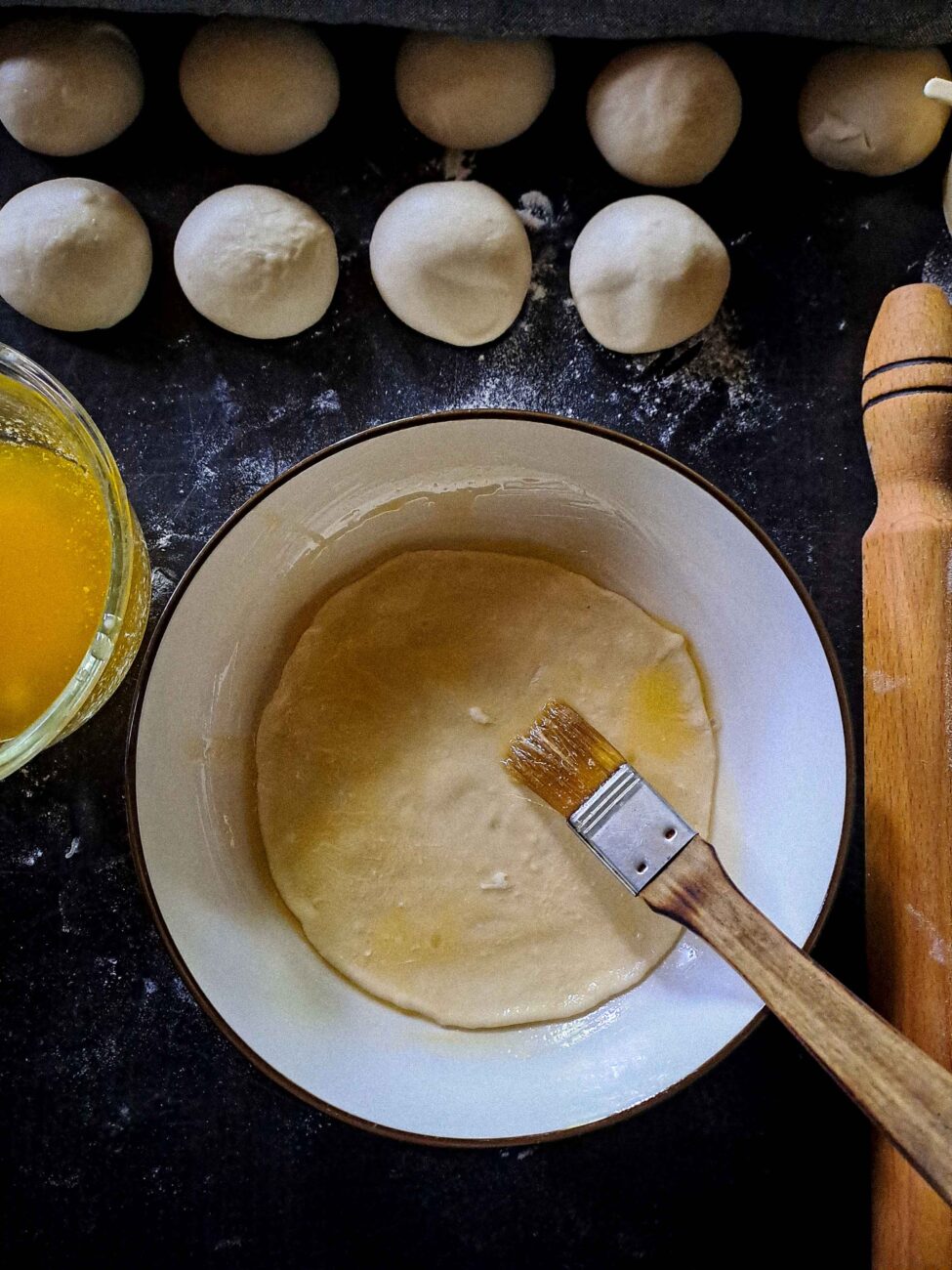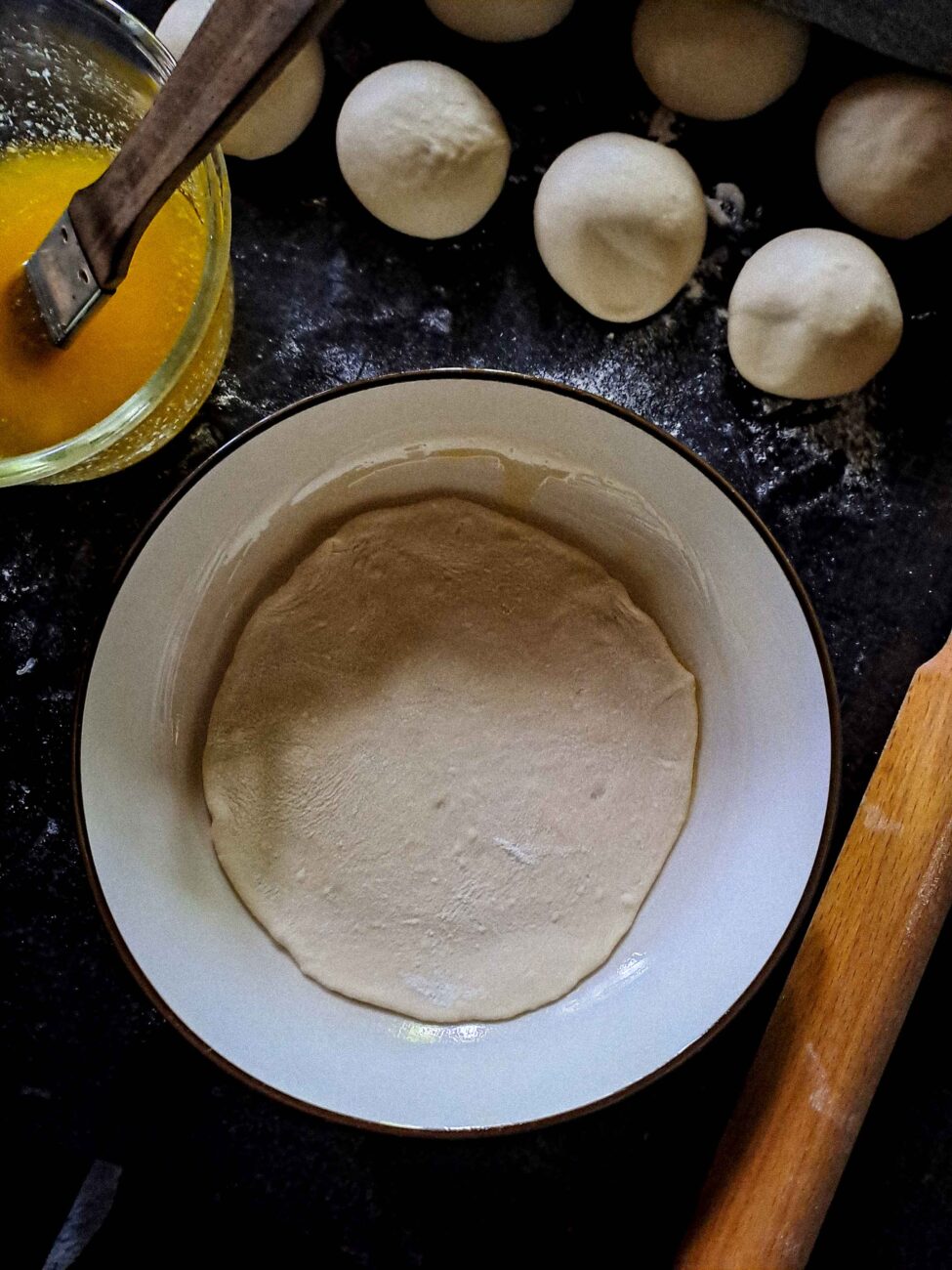 Активирайте маята в част от водата, докато шупне. Добавете и останалите продукти за тестото и измесете добре. Покрийте купата и оставете да втаса за 1-1.30 ч. Втасалото тесто изсипете върху набрашнена повърхност, разделете на 15 равни къса (ползвайте кухненска везна за повече прецизност), оформете топки, покрийте ги с памучна кърпа и оставете да починат 10-15 мин, след което разточете в кръг всяка от тях, намажете я обилно с мазнината, поставете в чиния.
