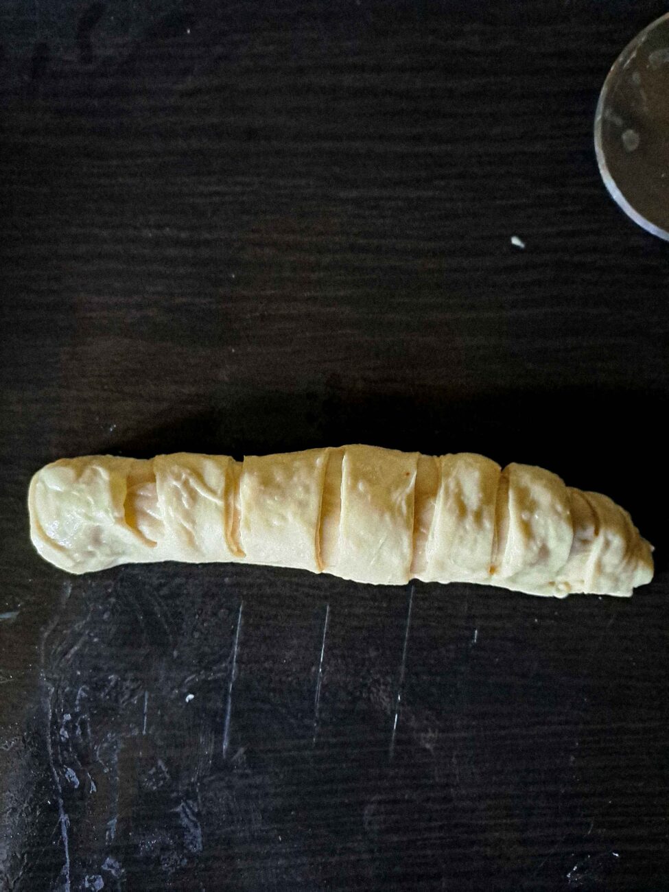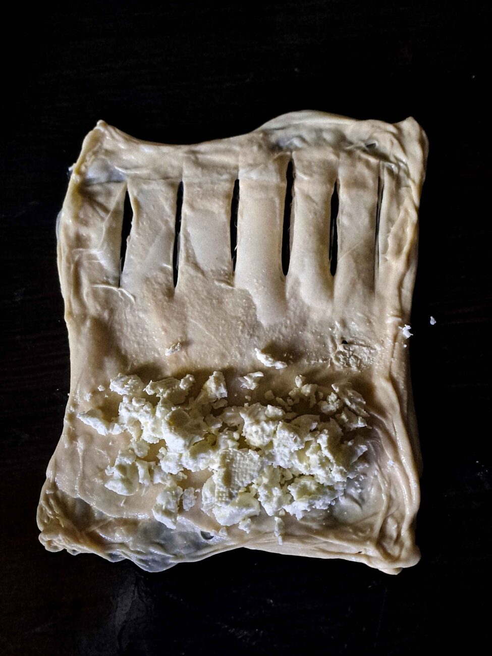 Всяка кора разтеглете максимално тънко, сгънете лявата 1/3 страна към центъра, след това дясната, горната и долната, сложете сиренето в единия край, направете 5-6 разреза от другата страна, навийте на руло (вижте снимките на оформянето), съберете двата края във формата на кръг, поставете в тавата, предварително покрита с хартия за печене.