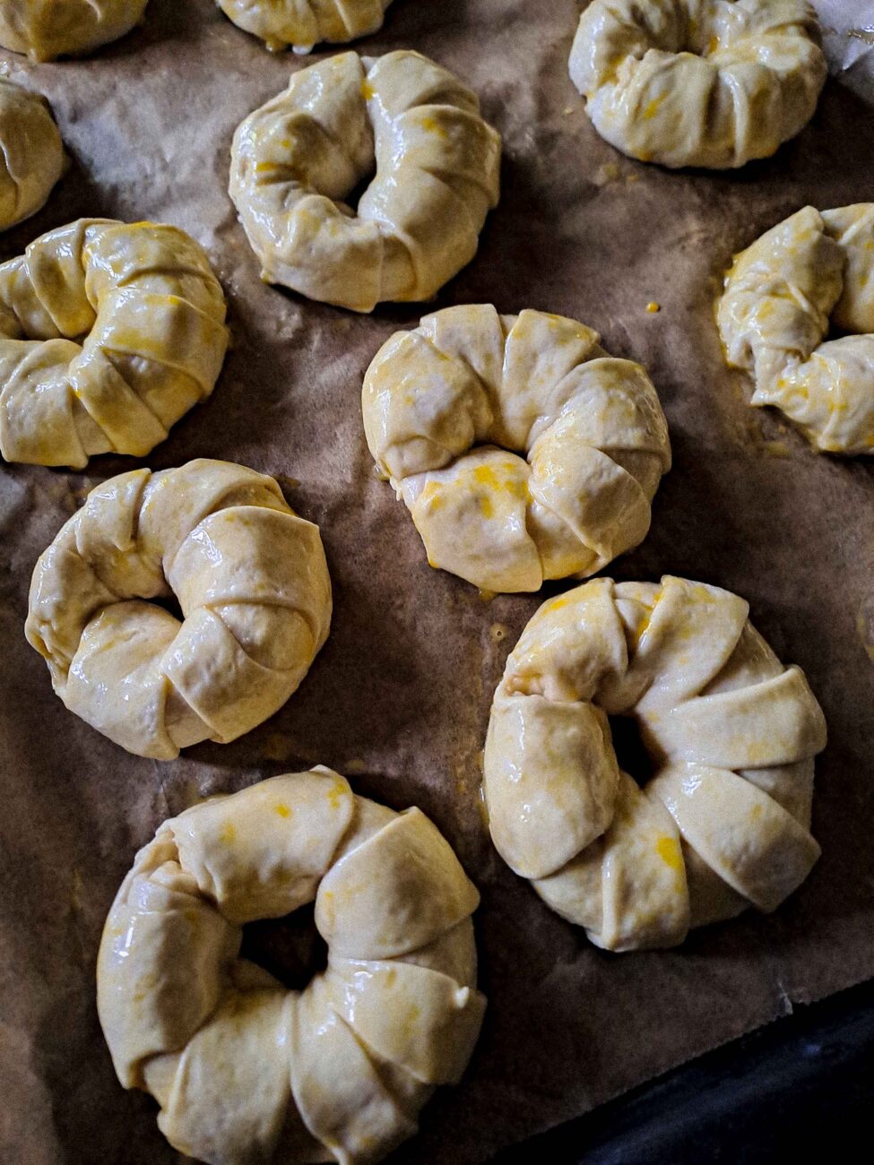 Покрийте тавата с фолио за 20-30 мин. и включете фурната да загрява на 200°C, намажете баничките с разбития жълтък и изпечете за 20-25 мин или до желания загар.