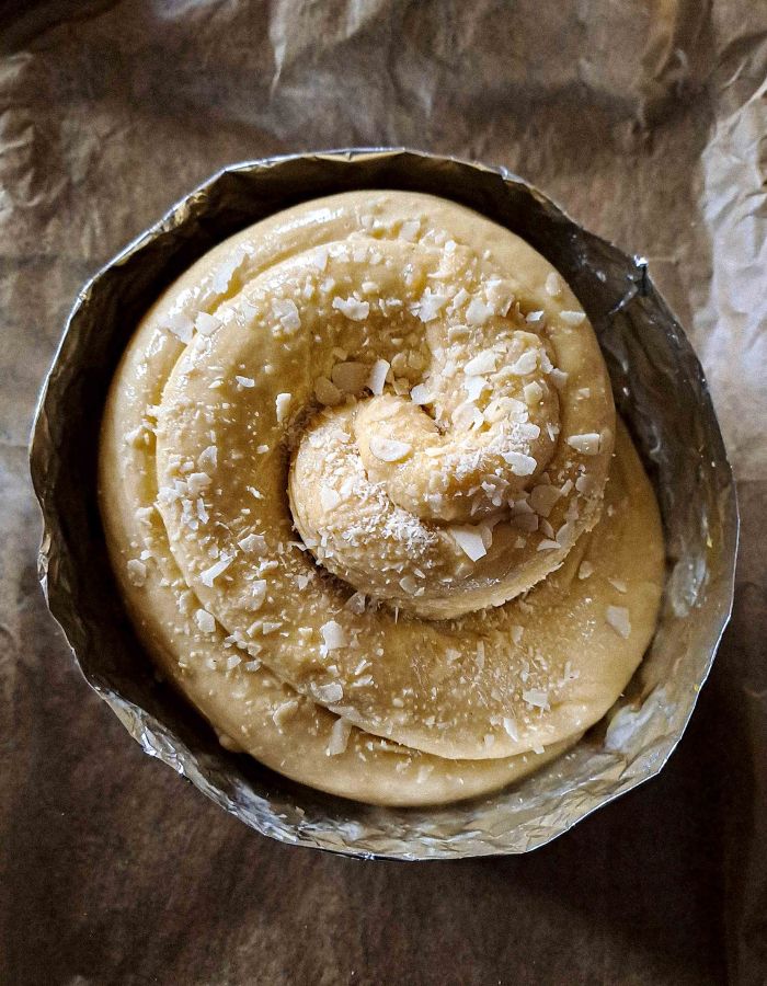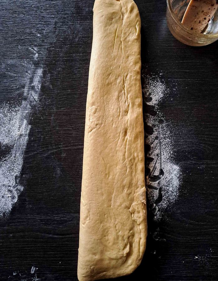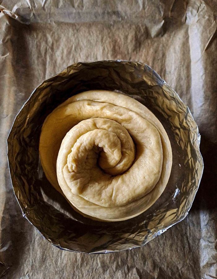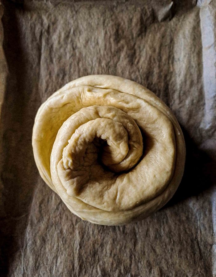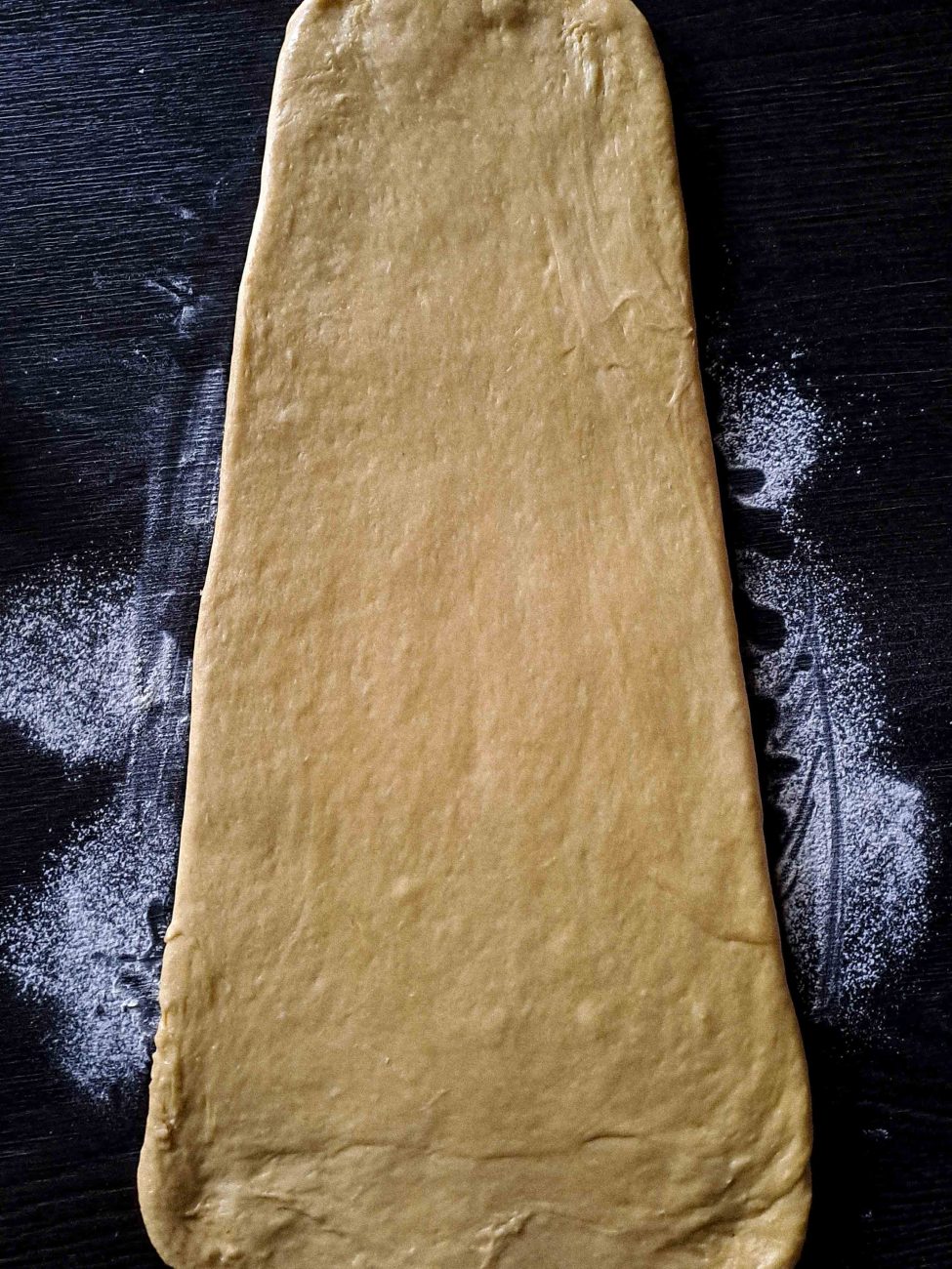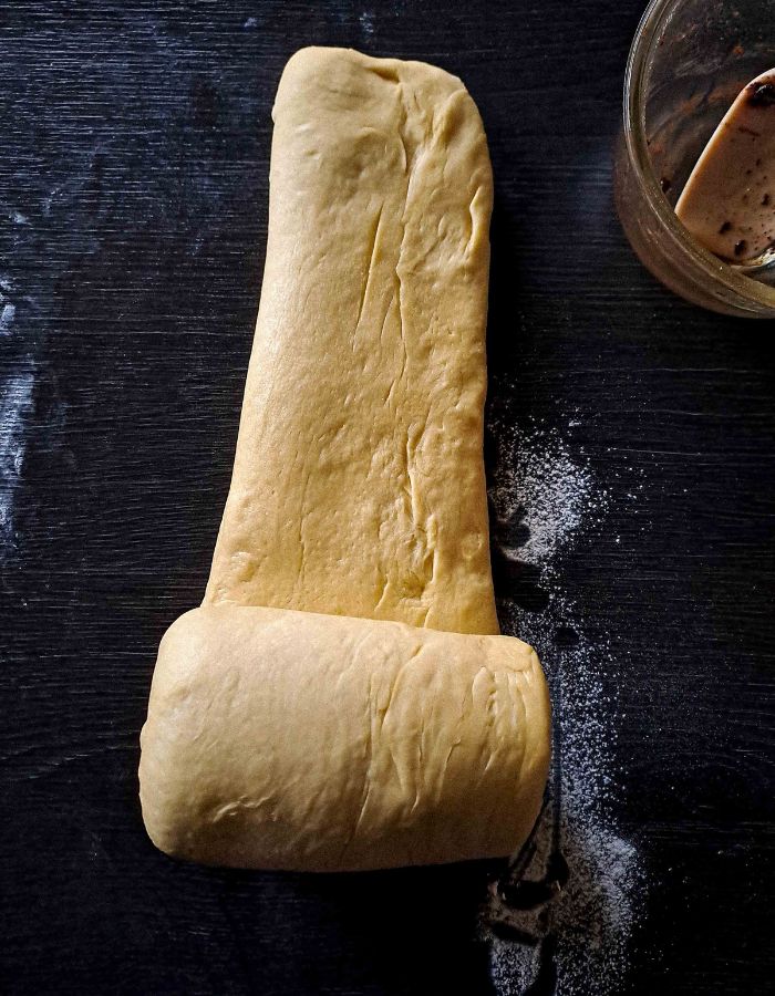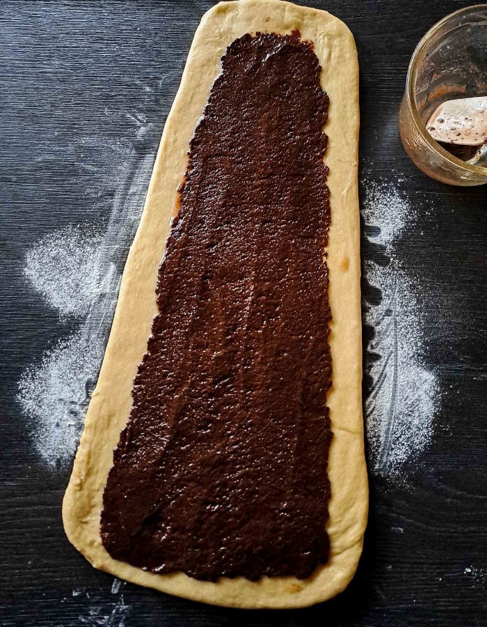 Когато тестото втаса, изсипете го върху леко набрашнен плот, разточете във форма на трапец с дължина около 50 см – в основата 25 см, в горната част 15 см. Намажете тестото с брауни пълнежа, сгънете го на две и навийте на руло, започвайки от по-широката част. Поставете го във формата и оставете да втаса отново.