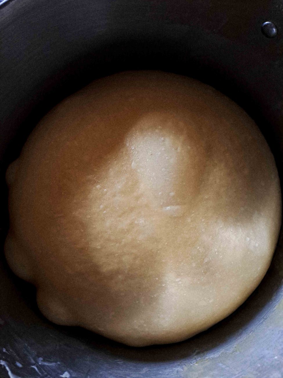 Направете едно вътрешно сгъване на тестото, след което оставете още 1 час да утрои първоначалния си обем. Времето за втасване може да варира от 5 до 8 часа в зависимост от температурата на околната среда.