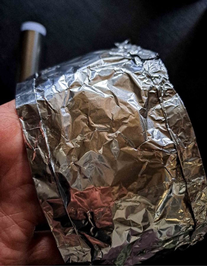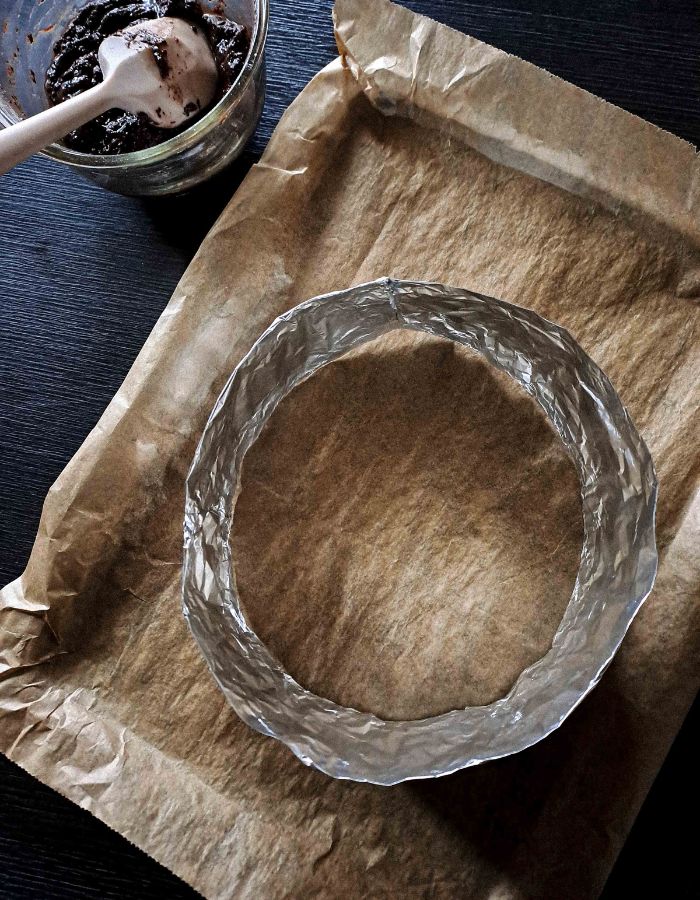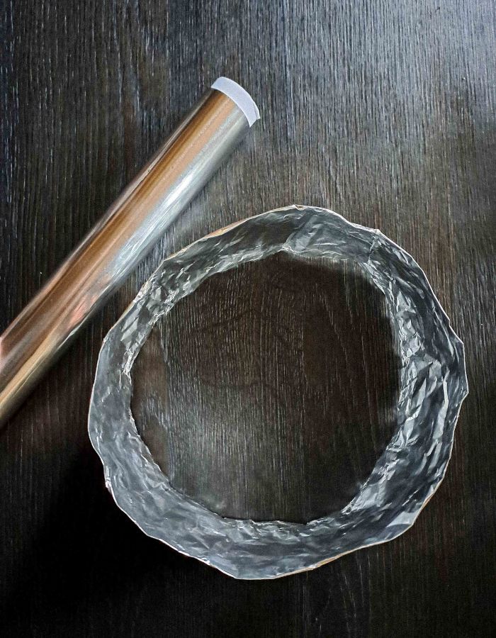 Ако нямате форма с подобен диаметър, можете да си направите от алуминиево фолио или хартия за печене. Ще ви трябва лист с дължина около 65-70 см – навийте няколко пласта, съберете двата края до нужния диаметър, сгънете малка част по ръбовете – отгоре и отдолу, за да ги фиксирате и готово.