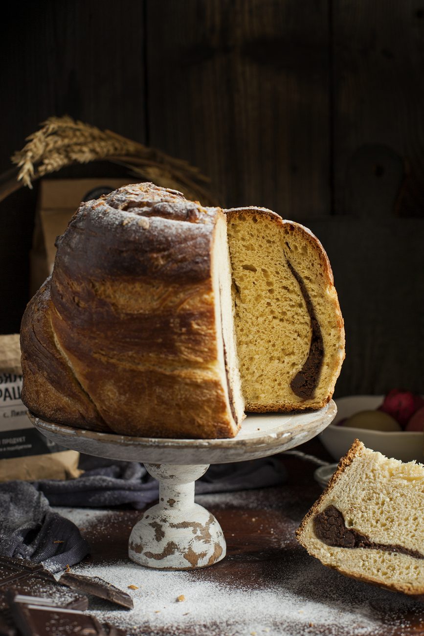 Преди печене намажете с разбит жълтък/яйце и, по желание, поръсете с филиран бадем. Изпечете в предварително загрята фурна на 200°C за 40-50 минути или до желаната загар.