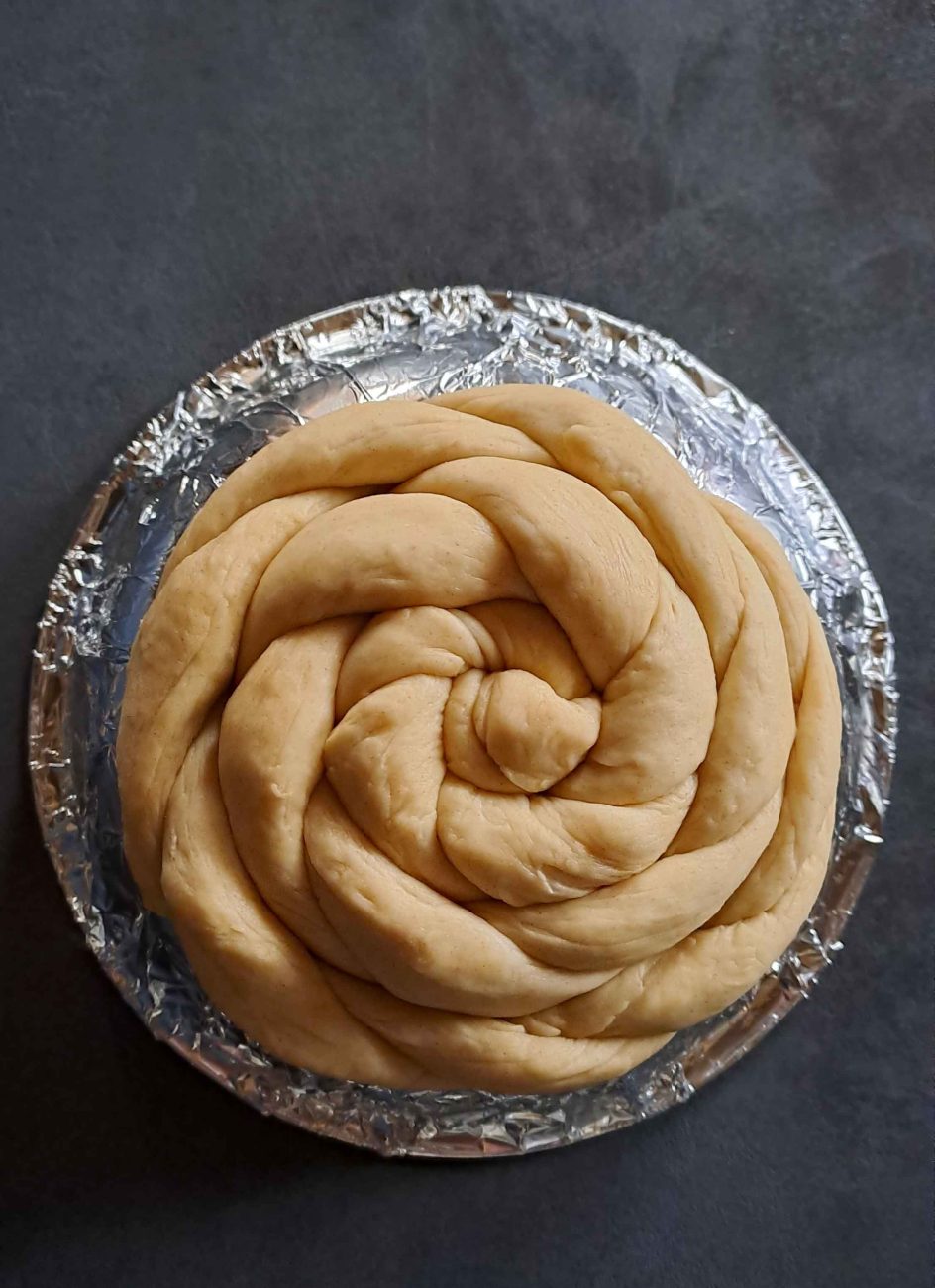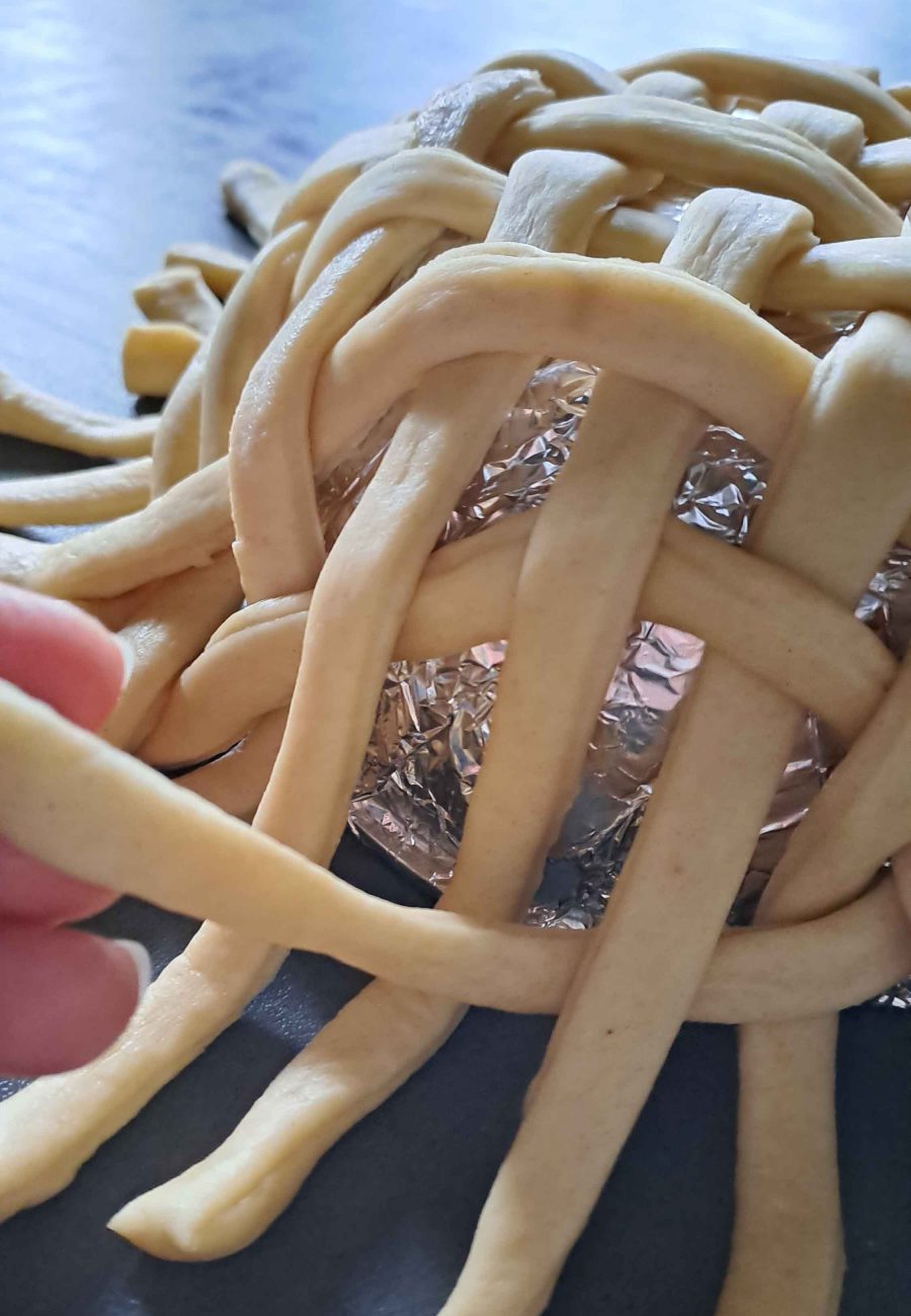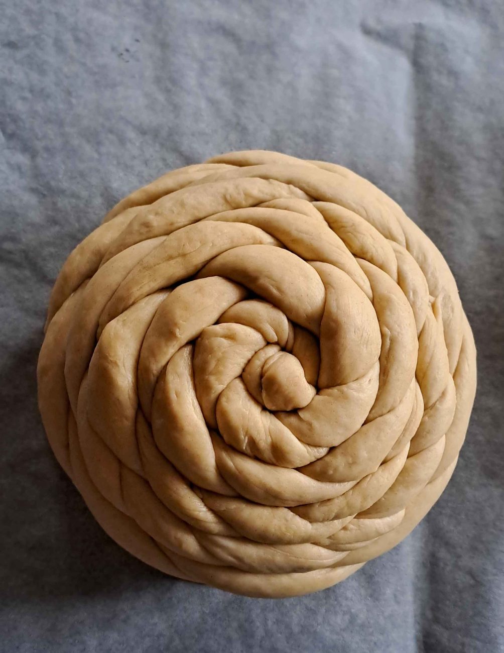 останалото разделете на 6 равни части, като от всеки къс оформете максимално тънък и дълъг фитил около 90-95 см. Преплетете ги по двойки и ги навийте плътно върху дъното на купата (вижте снимките от оформянето) като внимавате последната двойка да не стига до долу, защото ще се запече и ще се позагуби красотата на ръба.