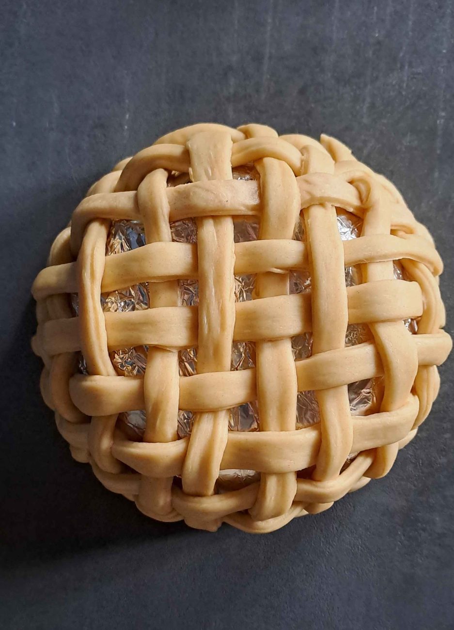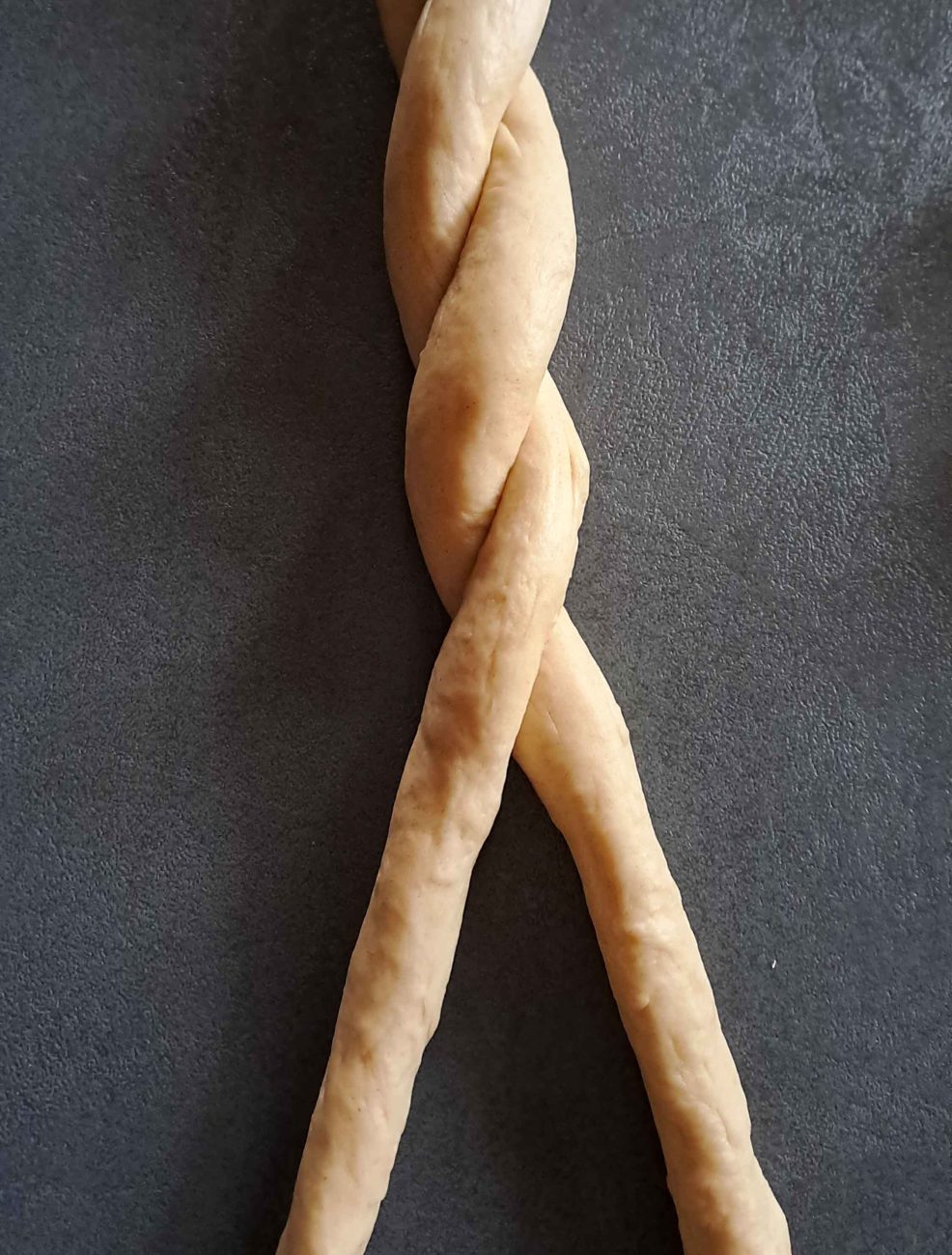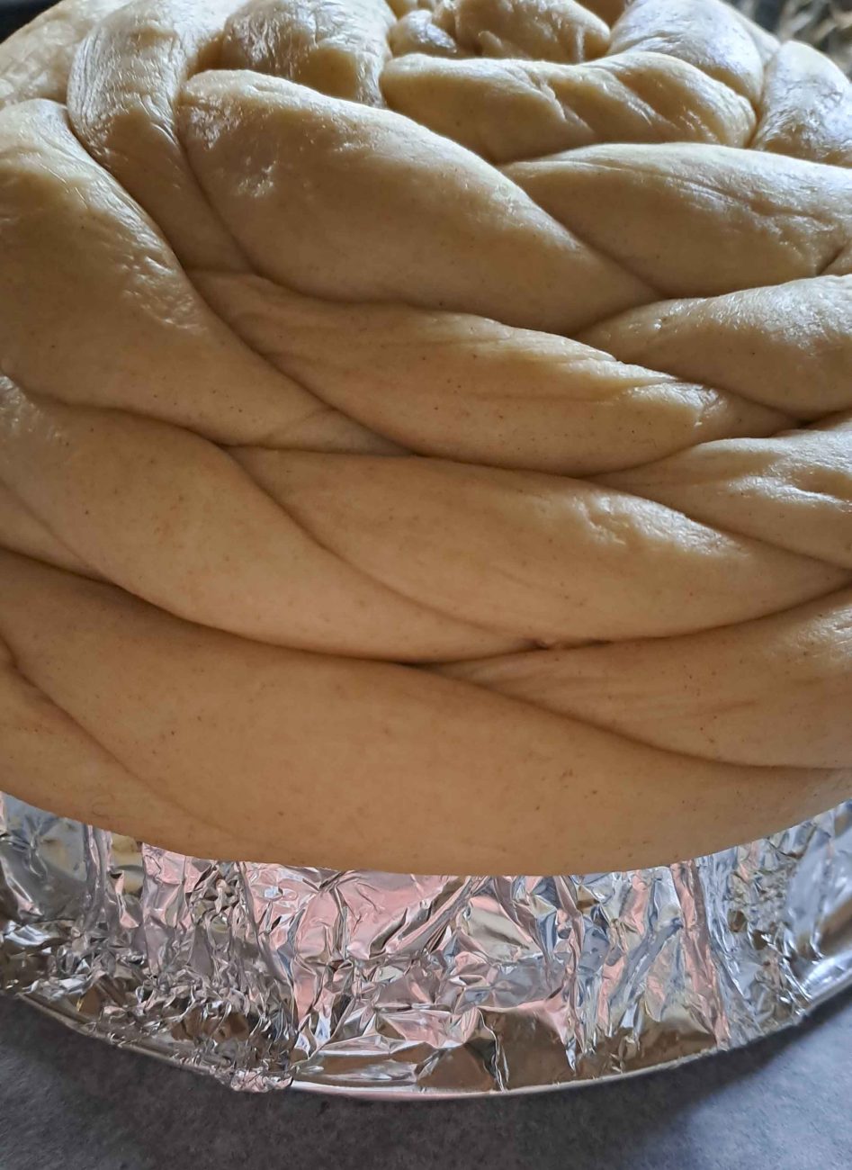 останалото разделете на 6 равни части, като от всеки къс оформете максимално тънък и дълъг фитил около 90-95 см. Преплетете ги по двойки и ги навийте плътно върху дъното на купата (вижте снимките от оформянето) като внимавате последната двойка да не стига до долу, защото ще се запече и ще се позагуби красотата на ръба.