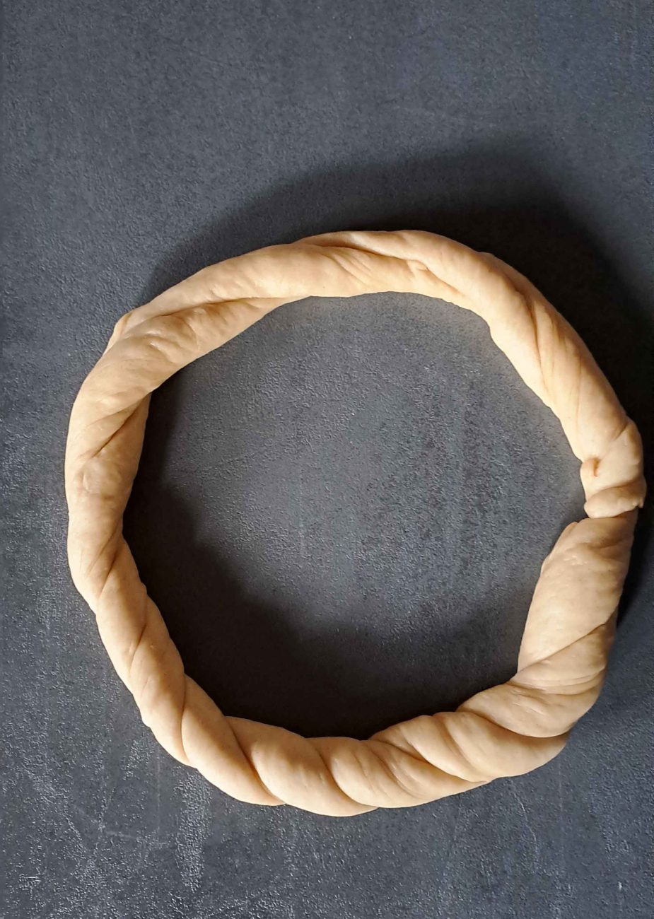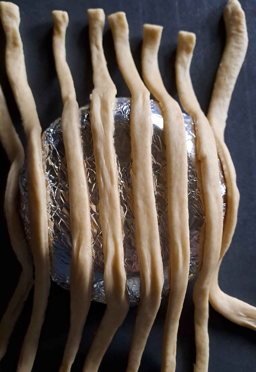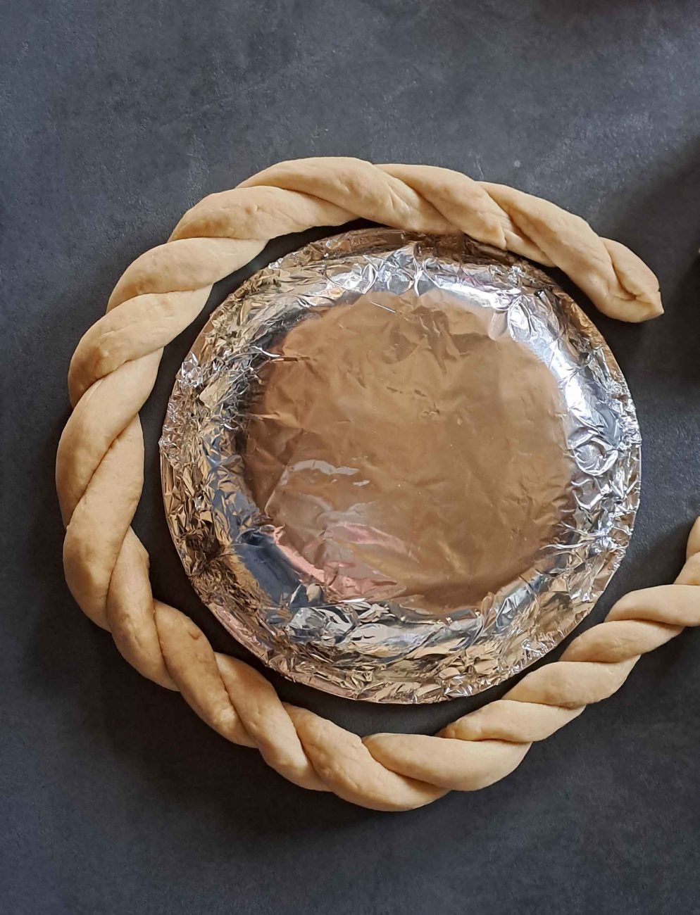 добавете към тестото за ръба, направете два фитила малко по-дълги от обиколката на ръба на купата, преплетете ги, защипете краищата.