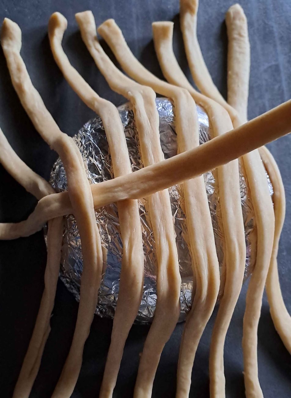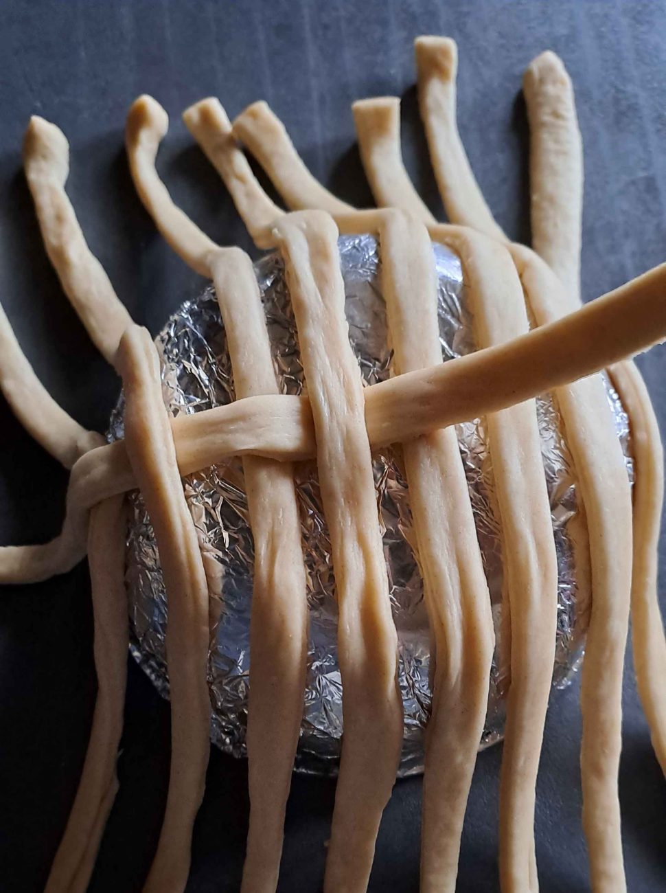 Тестото за кошницата разточете в квадратна форма с размери 30 х 30 см, нарежете 18 ивици. 8 от тях наредете хоризонтално на вас върху