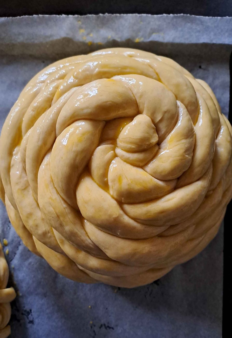 Загрейте фурната на 180С, намажете с разбития жълтък и изпечете за 25 мин