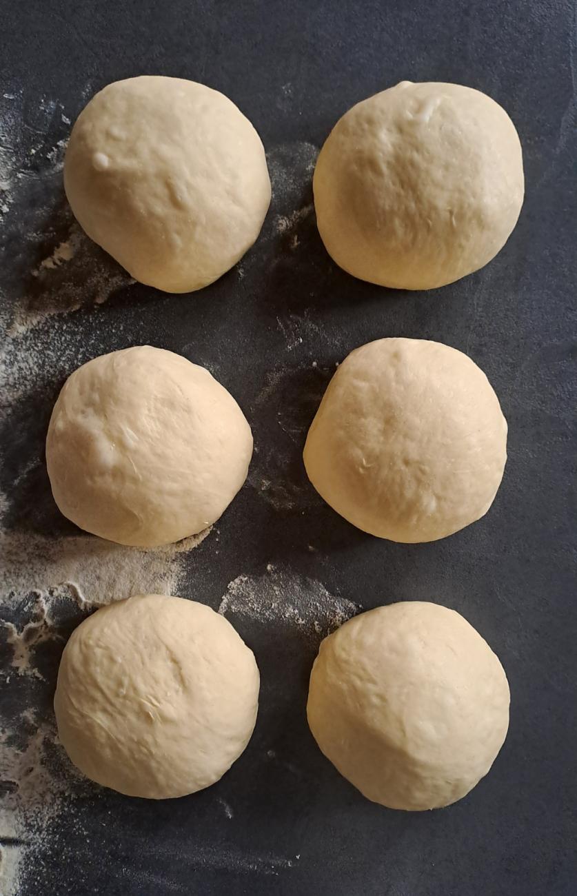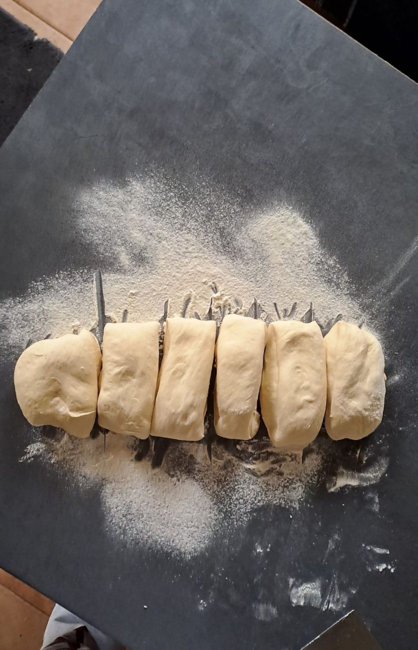 Омесете много добре тестото като вложите маслото накрая, покрийте го и оставете да удвои. Разделете втасалото тесто на 6 равни къса,