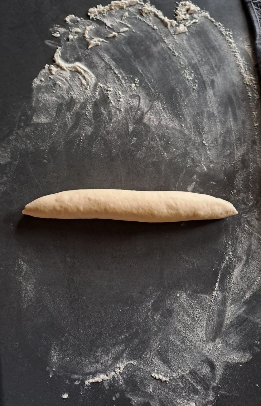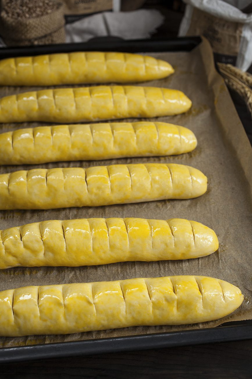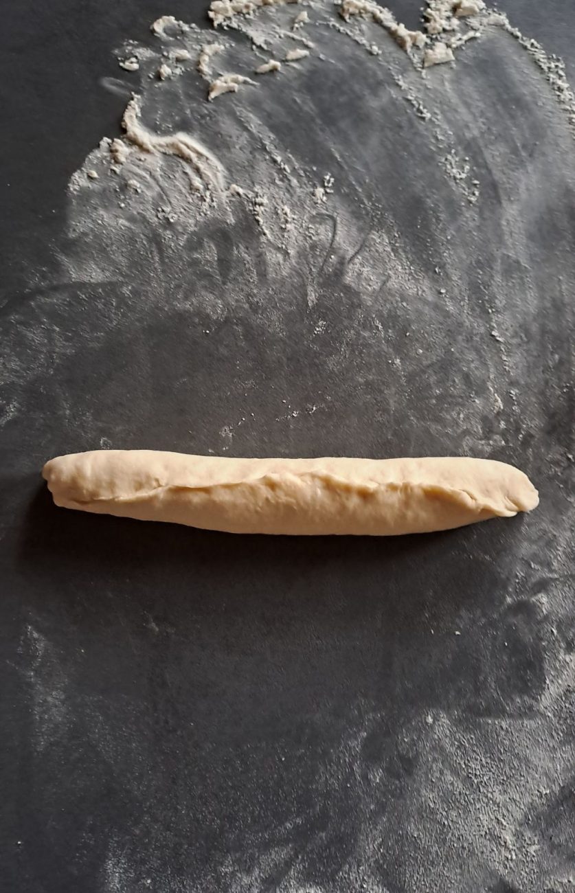 Всяка топка разточете в овална форма и я навийте на руло, прещипете краищата и поставете върху предварително постлана с хартия за печене тава.