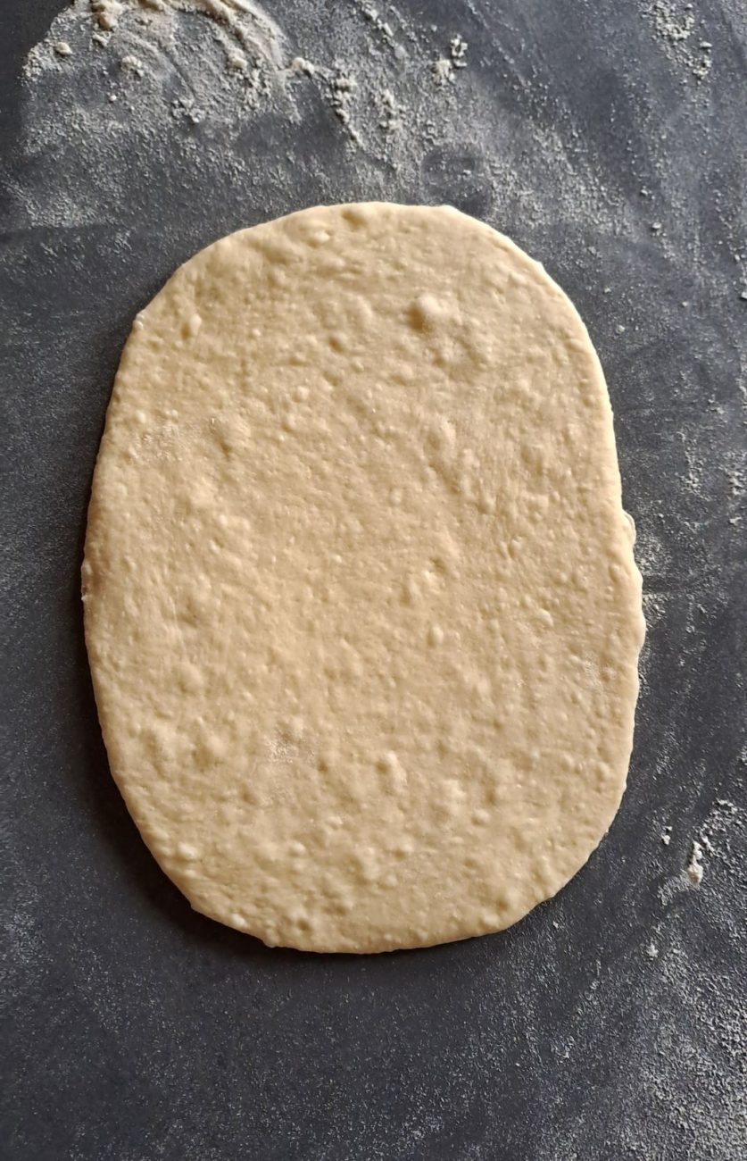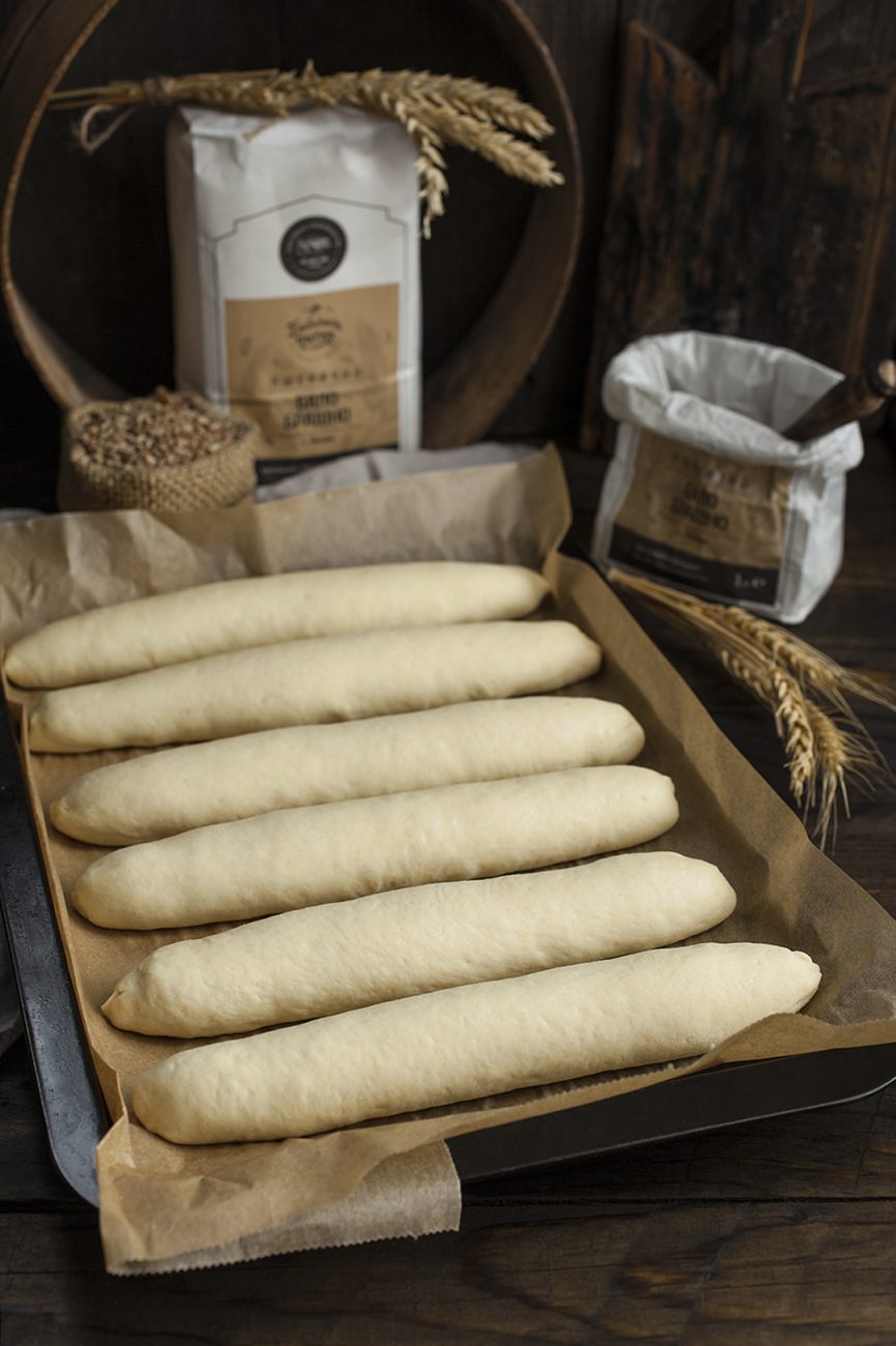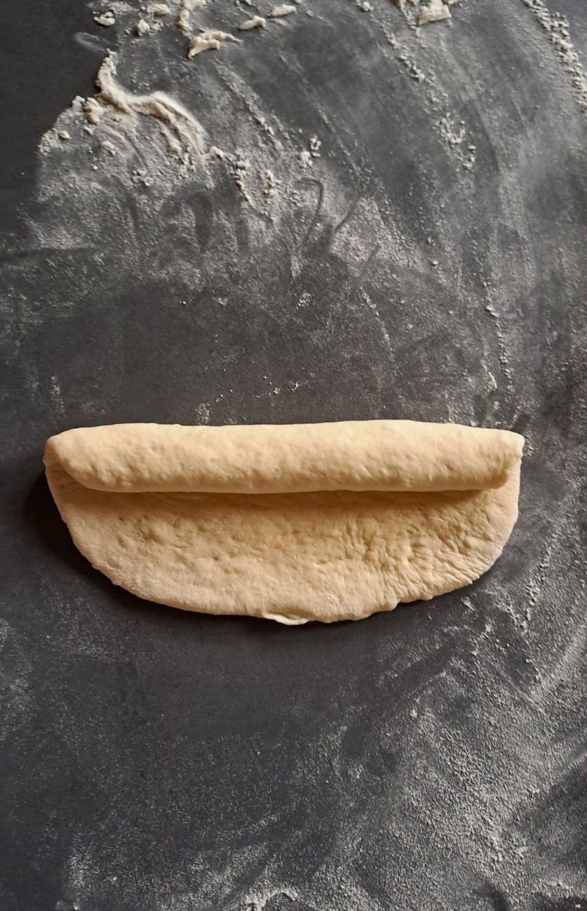 Всяка топка разточете в овална форма и я навийте на руло, прещипете краищата и поставете върху предварително постлана с хартия за печене тава.