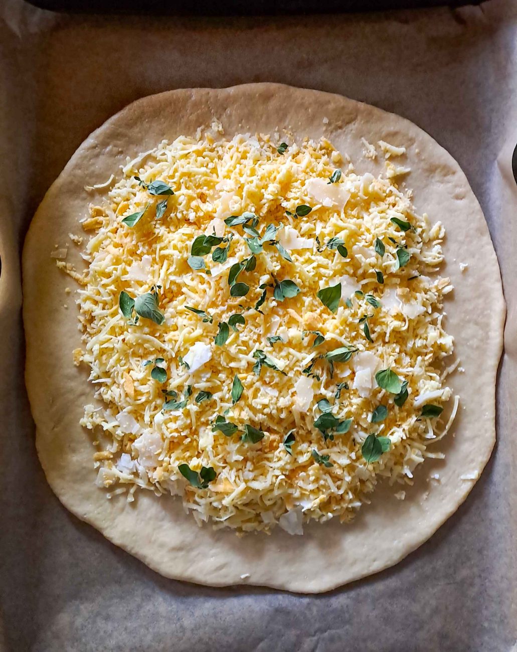 Омесете добре меко тесто от изброените продукти, оставете настрана за 1-1.30ч. да втаса. Изсипете втасалото тесто върху набрашнен плот, разделете го на два равни къса, разточете ги в кръг до дебелина 3-4 мм, като единия е с малко по-голям диаметър. Сложете по-голямата кора в тава върху хартия за печене, върху нея добавете настърганите сирена, кашкавала и ригана, отгоре сложете другата кора, прегънете долния край върху горната кора със защипване и оформете борд.