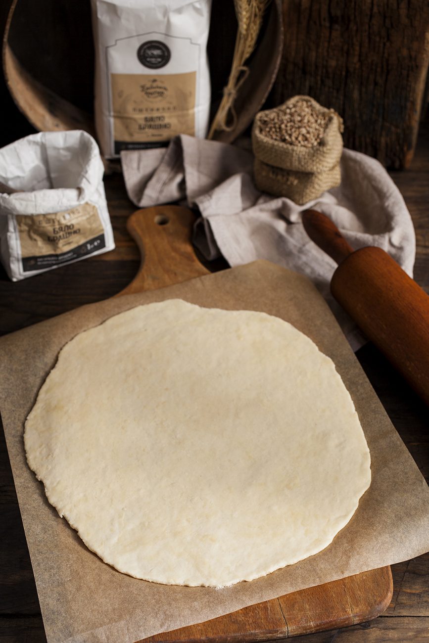 Извадете охладеното тесто, поставете го върху лист пекарска хартия и разточете в овална форма (или по ваш избор), до дебелина около 3-4 мм