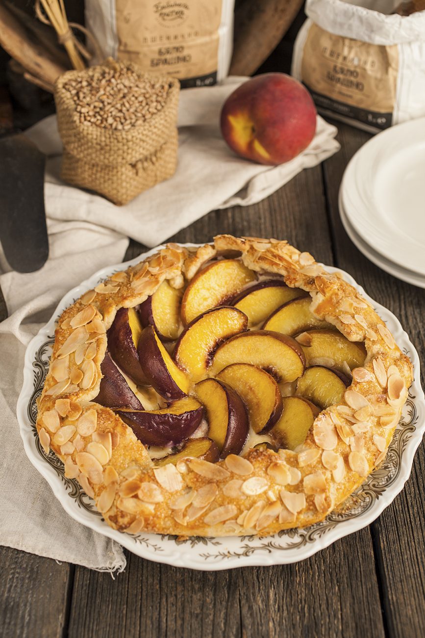 Извадете тестото, разточете върху хартия за печене в кръг (или друга форма) до дебелина 3 мм, както вече споменахме – не се старайте да е с идеална форма, даже напротив. Намажете с крема сиренето като оставяте около 3 см свободно тесто в краищата. Подредете резените праскови и прегънете краищата. Нарежете масло и разположете на няколко места върху прасковите, с разбитото яйце, поръсете със филирани бадеми и захар по желание.