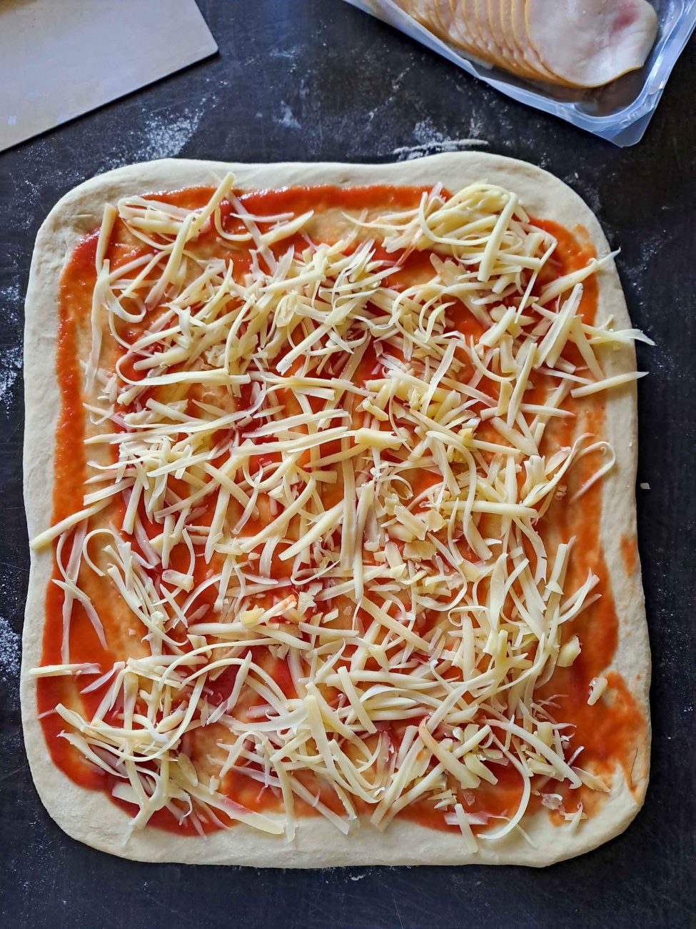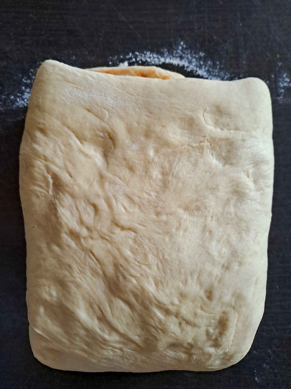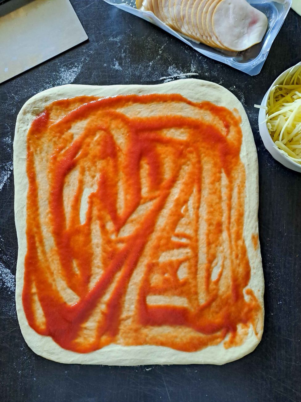 Активирайте маята в част от прясното мляко и захарта. Пропуснете тази стъпка, ако сте сигурни в качествата на маята. Омесете меко тесто от изброените продукти, покрийте купата и го оставете настрана да втаса до удвояване. Когато тестото втаса, поръсете плота с малко брашно и изсипете внимателно тестото. С ръце леко оформете на правоъгълник и разточете до размери 40х30, намажете с доматеното пюре, поръсете избраното сирене, а върху него и колбаса. Сгънете дясната страна на 1/3, след което и лявата и сгънете на две.