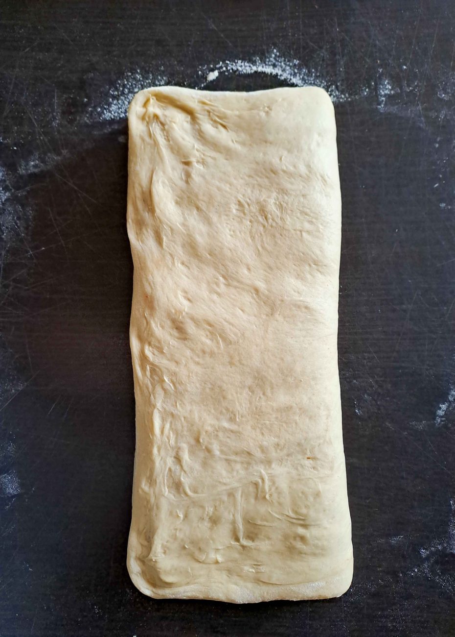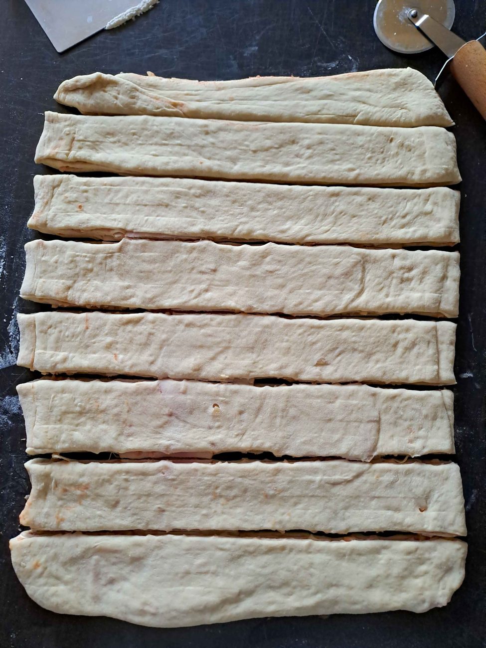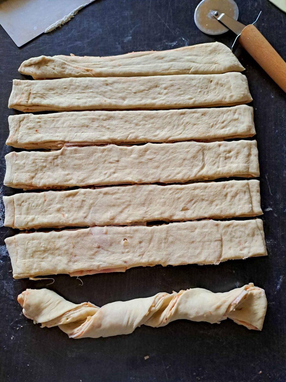 Оставете да се отпусне за 15-20 мин и разточете отново на правоъгълник 40х30 см кора, нарежете с нож за пица 8 ленти, навийте на спирала всяка от тях, сгънете на кръг и защипете краищата.