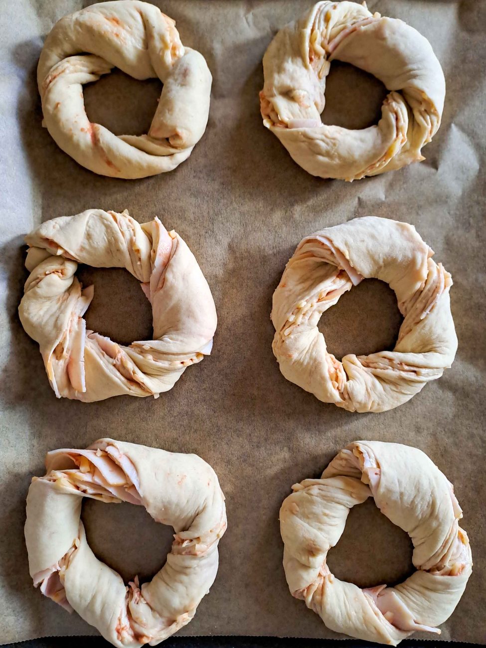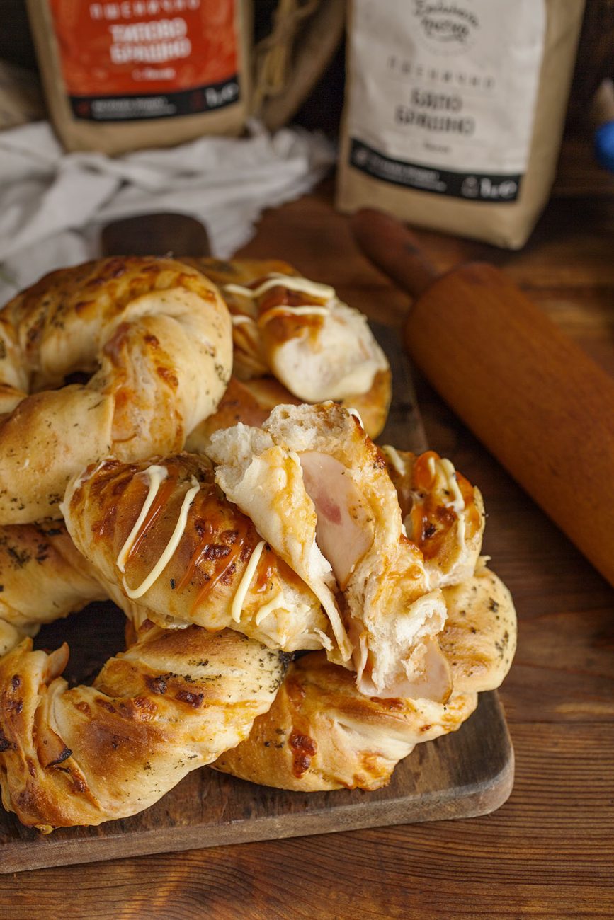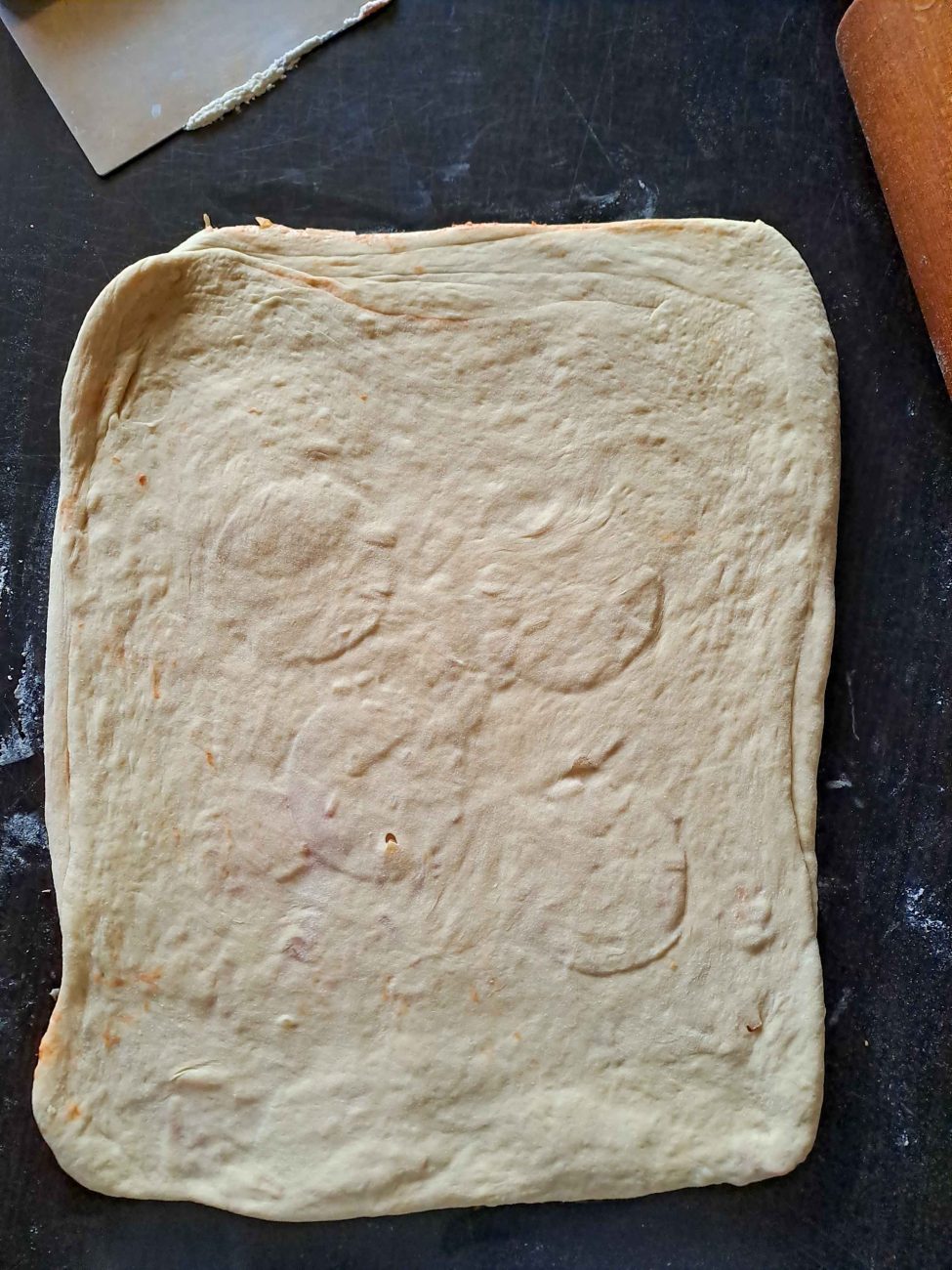 Оставете да се отпусне за 15-20 мин и разточете отново на правоъгълник 40х30 см кора, нарежете с нож за пица 8 ленти, навийте на спирала всяка от тях, сгънете на кръг и защипете краищата.