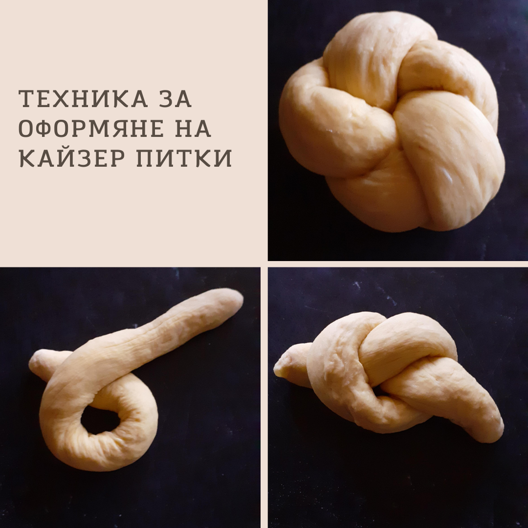 Когато тестото удвои обема си, изсипете го внимателно върху набрашнен плот. С помощта на кухненска везна разделете на 8 равни части. Оформете топки и ги оставете покрити, да починат около 20-30 мин. От всяка топка, направете фитил с дължина около 35-40 см и оформете с преплитане или може да си останат като питка за бургери (вижте снимките).