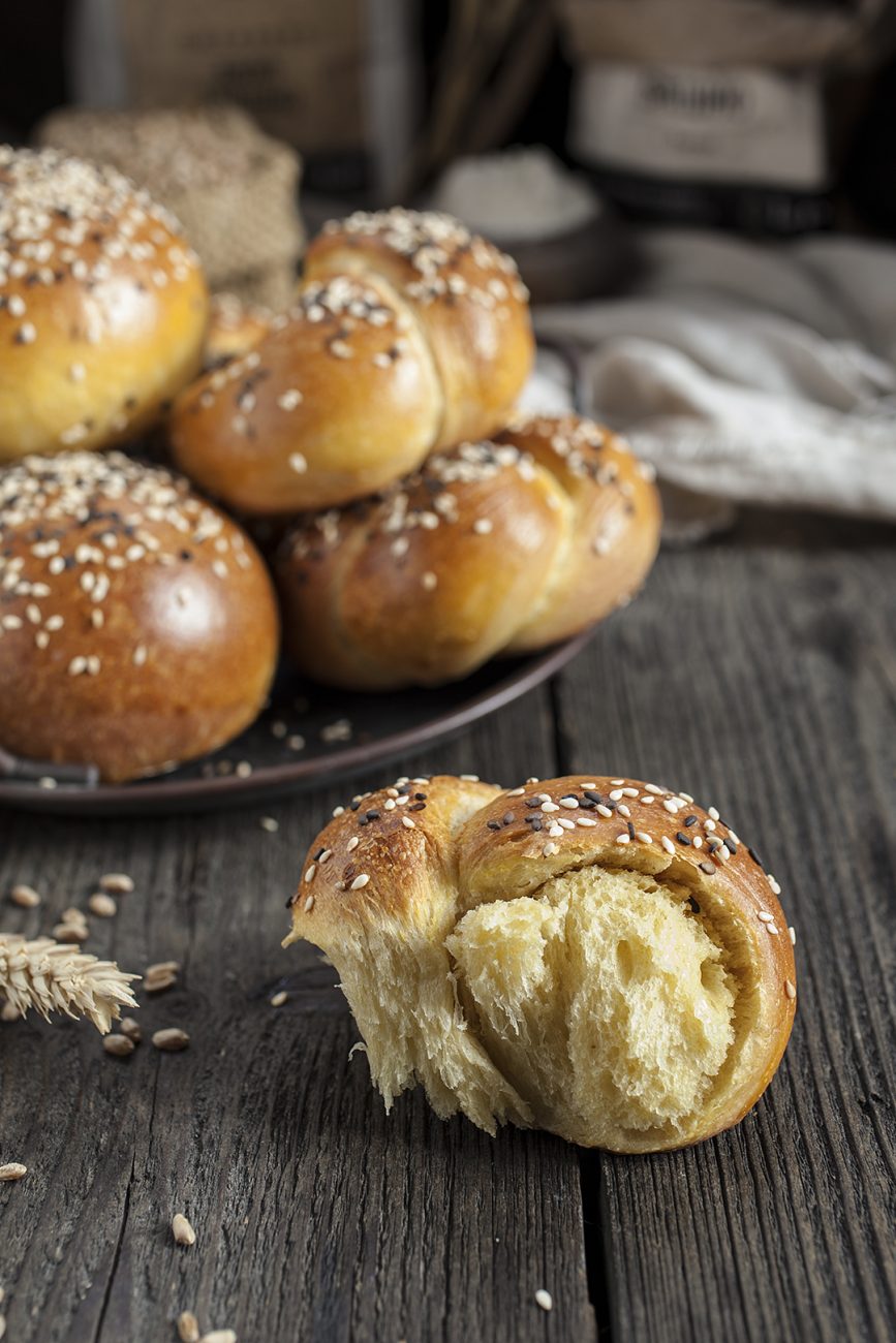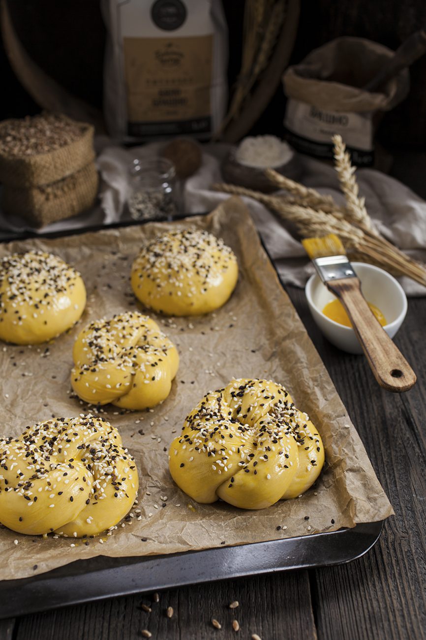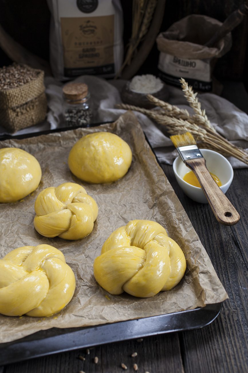 Преди печене загрейте фурната на 190С, намажете питките с прясно мляко+жълтък и поръсете със семената.