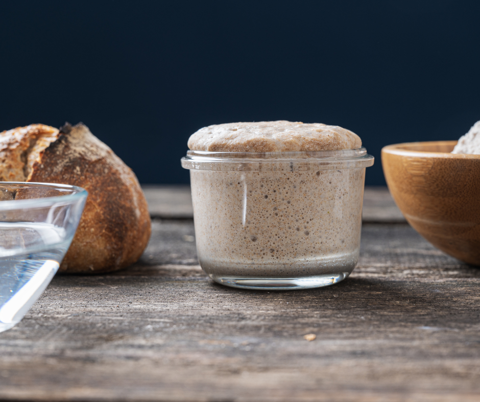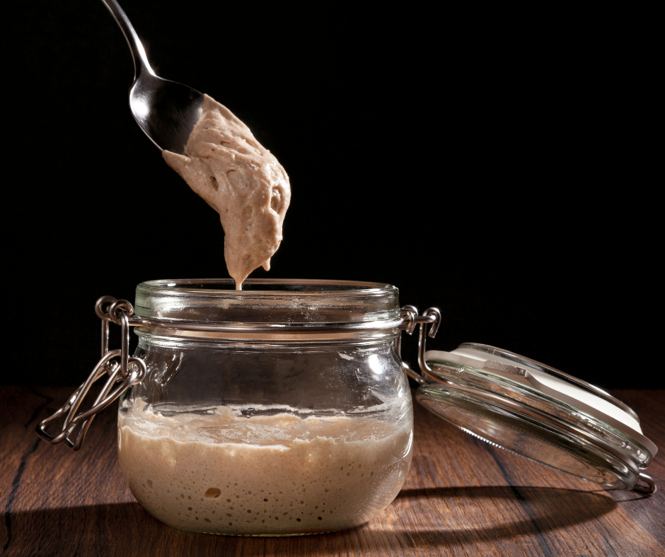 В чист буркан сложете 30 г вода и 30 г брашно, разбъркайте добре. Покрийте буркана с марля на няколко ката и захванете с ластик. Бурканът може да бъде затворен и с капачка, но в началото „дишането“ и взаимодействието на сместа с околната среда е важно и марлята осигурява тази обмяна да живителни сили. Оставяте буркана на стайна температура, добре е стаята да е топла. В хладно помещение процесът ще се забави, а може и да не започне.