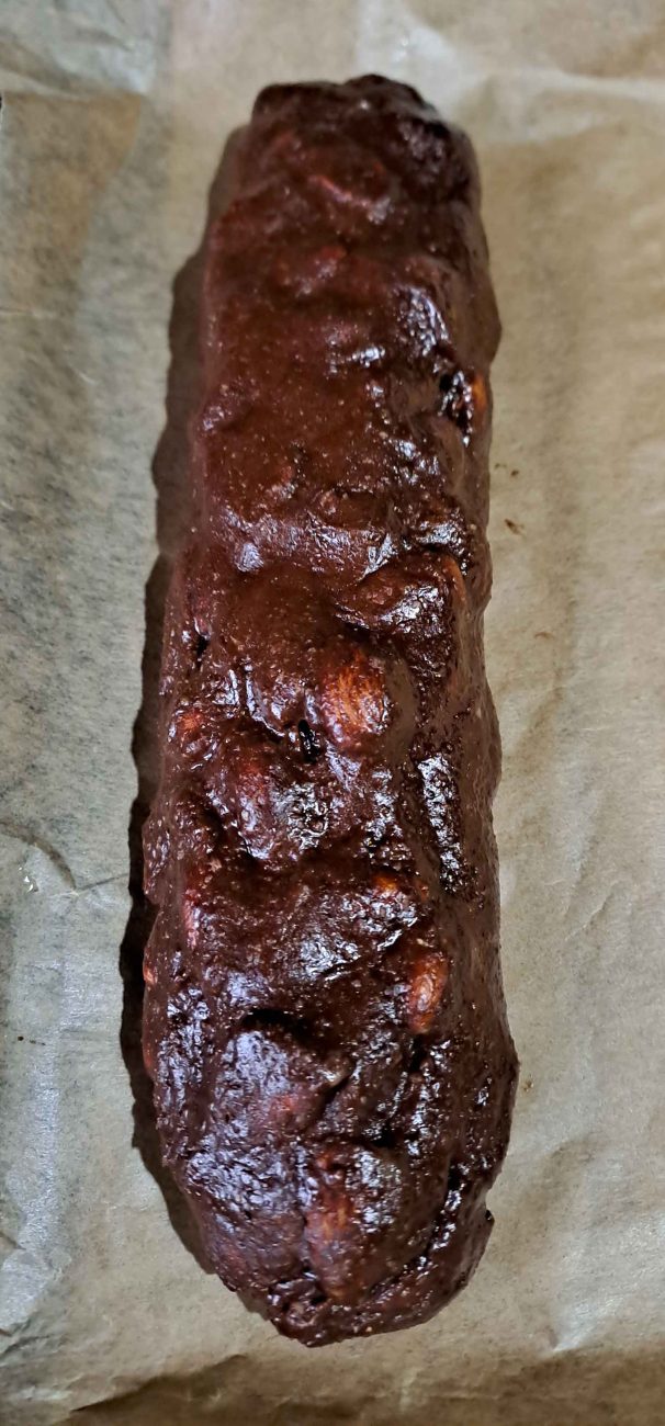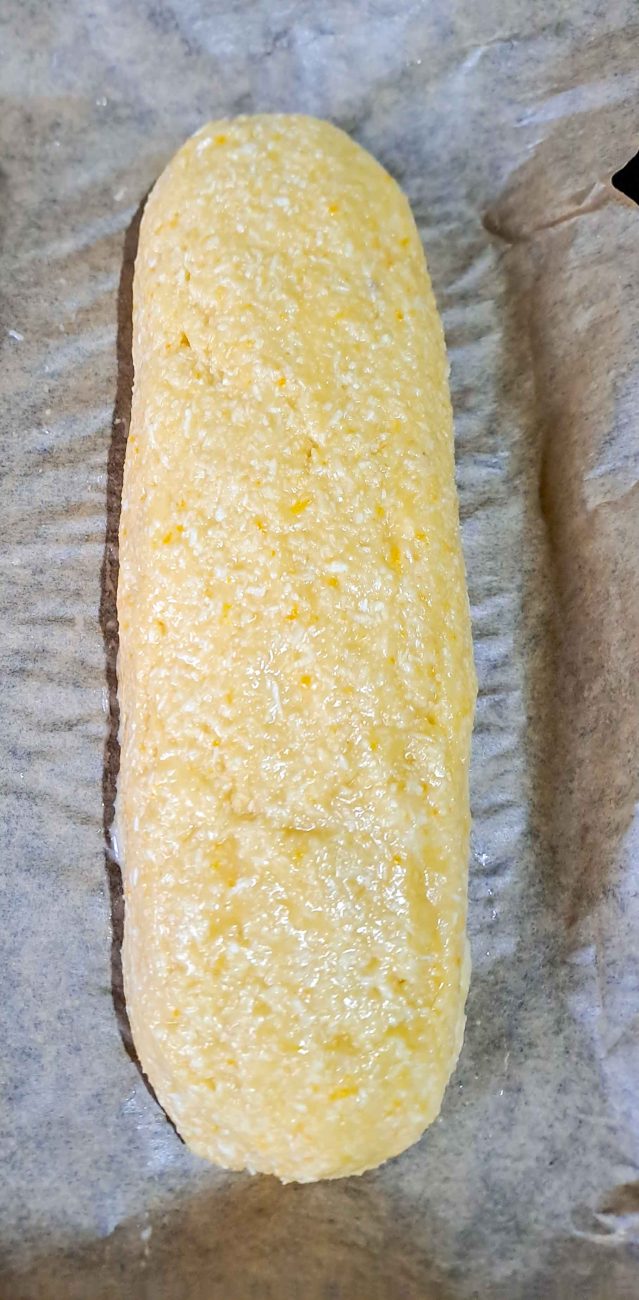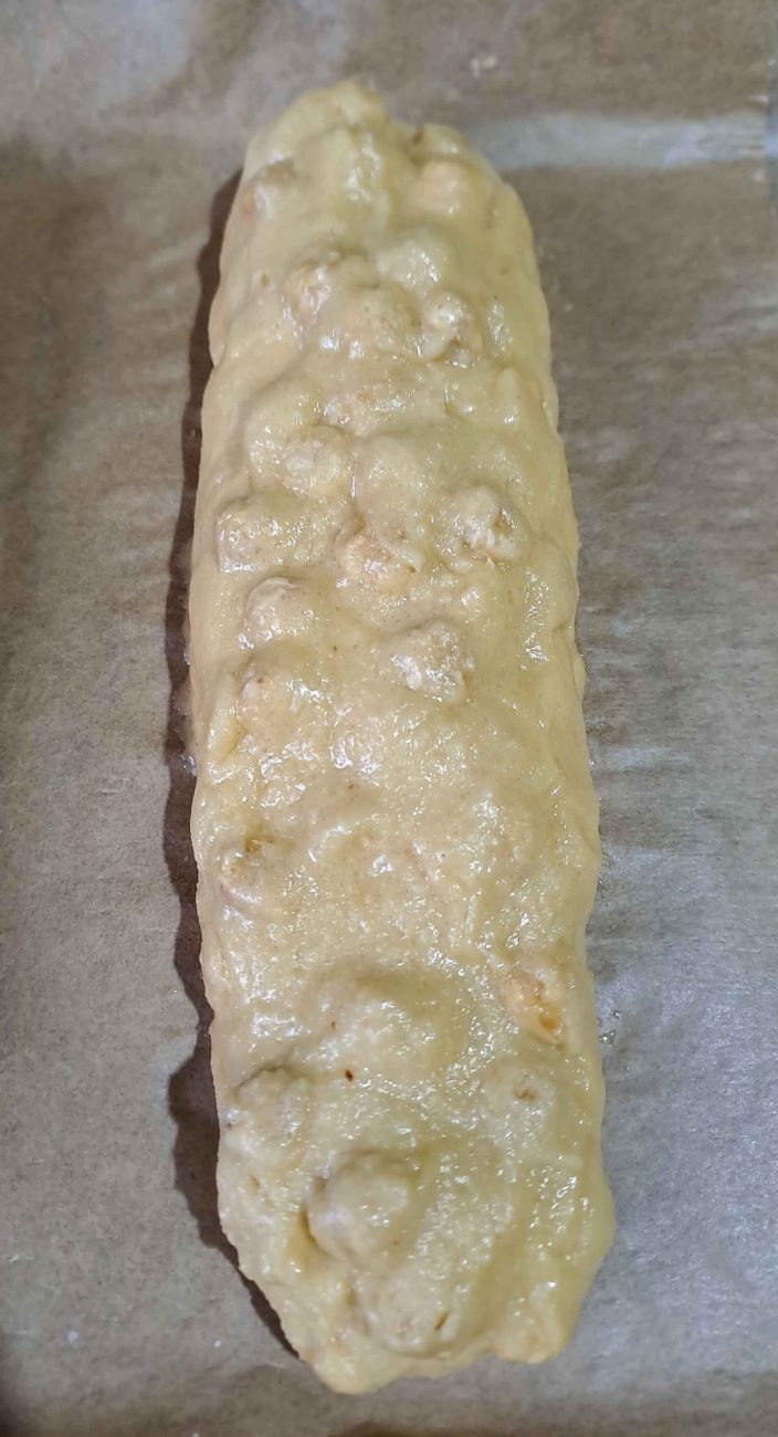 Разбийте добре яйцето и захарта до хубав крем. Добавете предварително смесените сухи съставки и разбъркайте с помощта на шпатула, докато се смесят. Прибавете запечените бадеми и разбъркайте добре. С мокри ръце оформете дълга ивица с ширина до 5 см върху тава, покрита с хартия за печене.