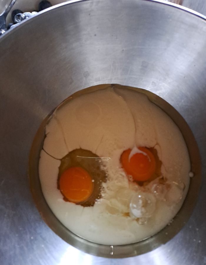 В друга купа разбийте добре яйцата с ръчен миксер за кратко или с бъркалка за яйца. Прибавете млякото и слънчогледовото олио и разбъркайте добре.