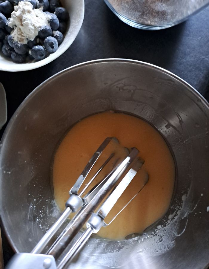 Предварително загрейте фурната на 180°C без вентилатор и подгответе формите за кексчета. Оваляйте измитите и подсушени боровинки в 1 супена лъжица брашно, за да не потънат в кексовата смес.