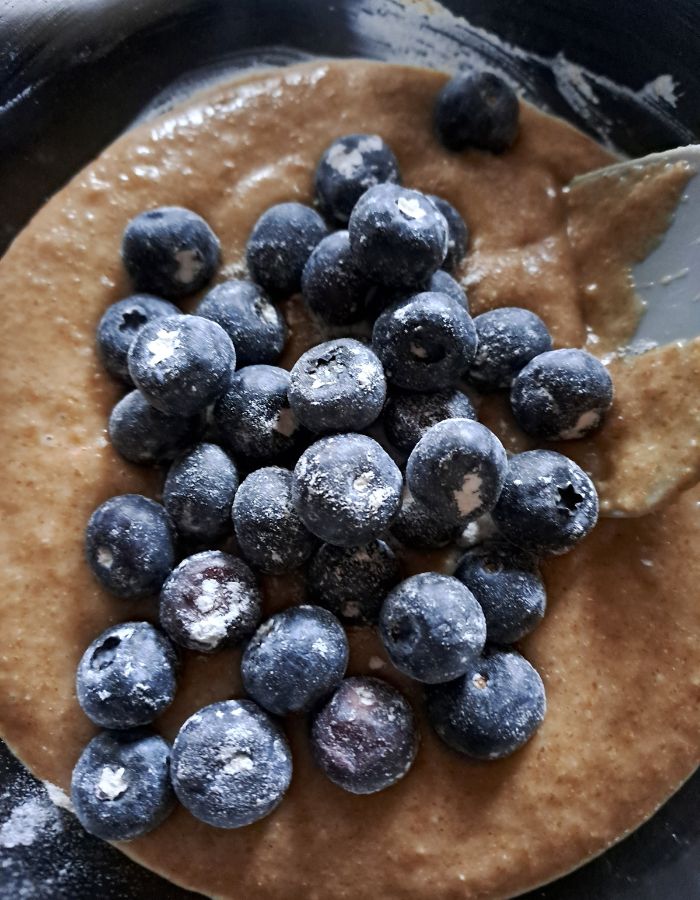 Постепенно добавете мокрите съставки към сухите, разбърквайки със силиконова шпатула или лъжица, докато се получи хомогенна смес. Накрая прибавете оваляните боровинки и разбъркайте отново.