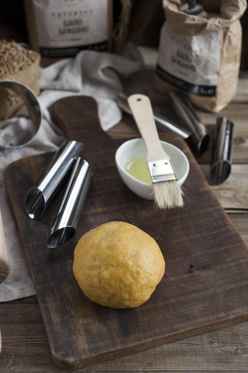 Преминаваме към тестото. Замесете тестото средно твърдо тесто, като маслото вложете на края. Оставете го на студено поне за 1 ч, след което върху леко набрашнен плот, разточете тестото до дебелина около 3 мм (колкото по-тънко е разточено, толкова по-хрупкава ще е черупката).