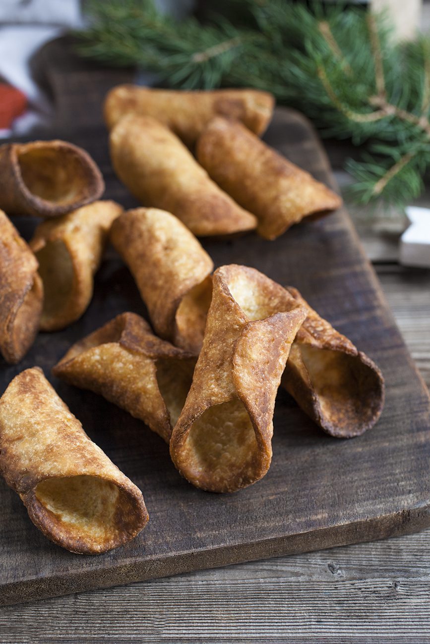 Когато мазнината стигне необходимата температура, поставете внимателно в олиото 3-4 формички и изпържете до тъмно-златист цвят от всички страни. Отнема около 1 мин. на страна. Извадете с помощта на щипка и оставете да се охладят върху кухненска хартия или решетка. Формичките лесно се вадят от готовите черупки, но внимавайте все пак при ваденето. Повторете същото с другите.