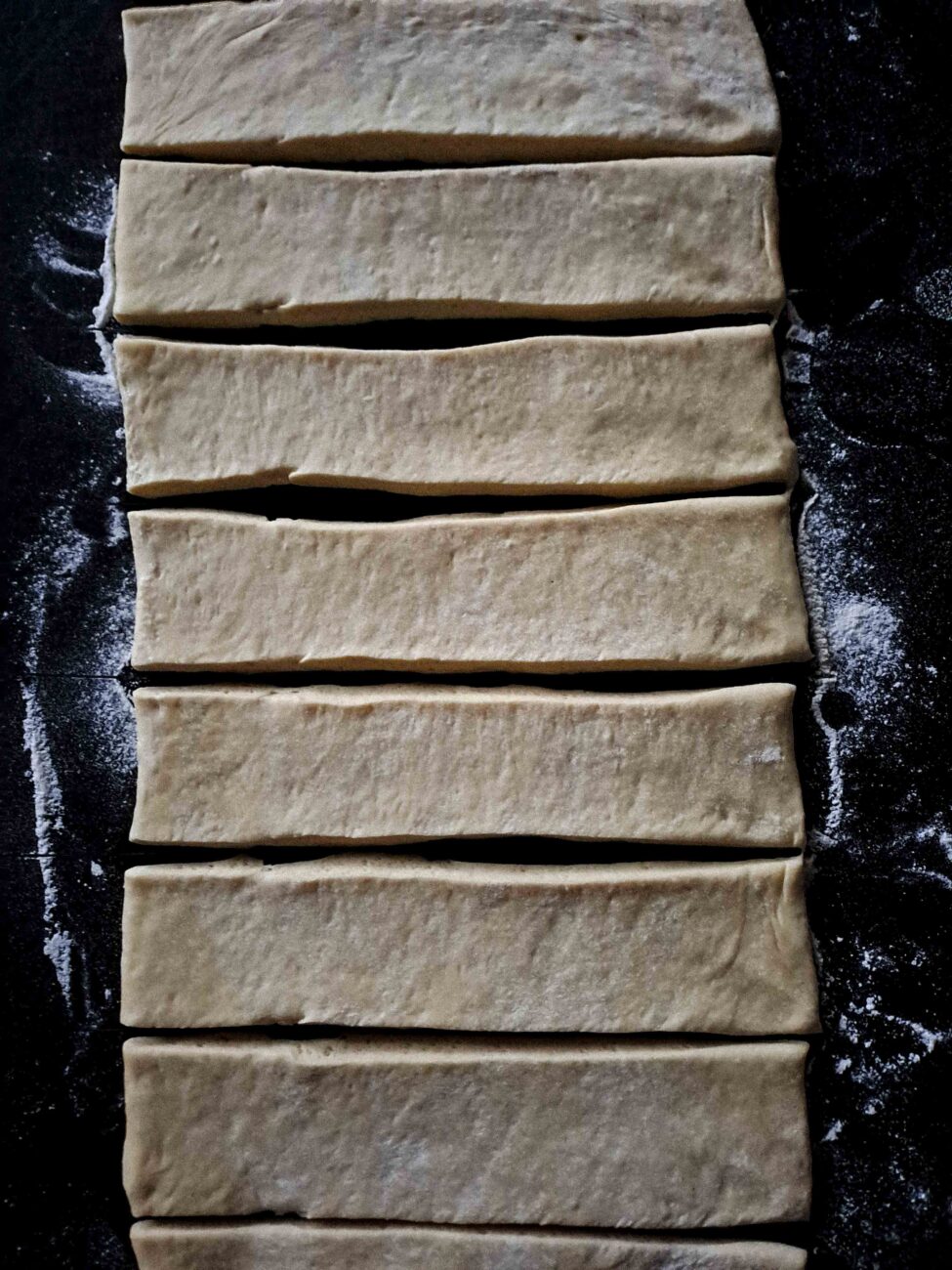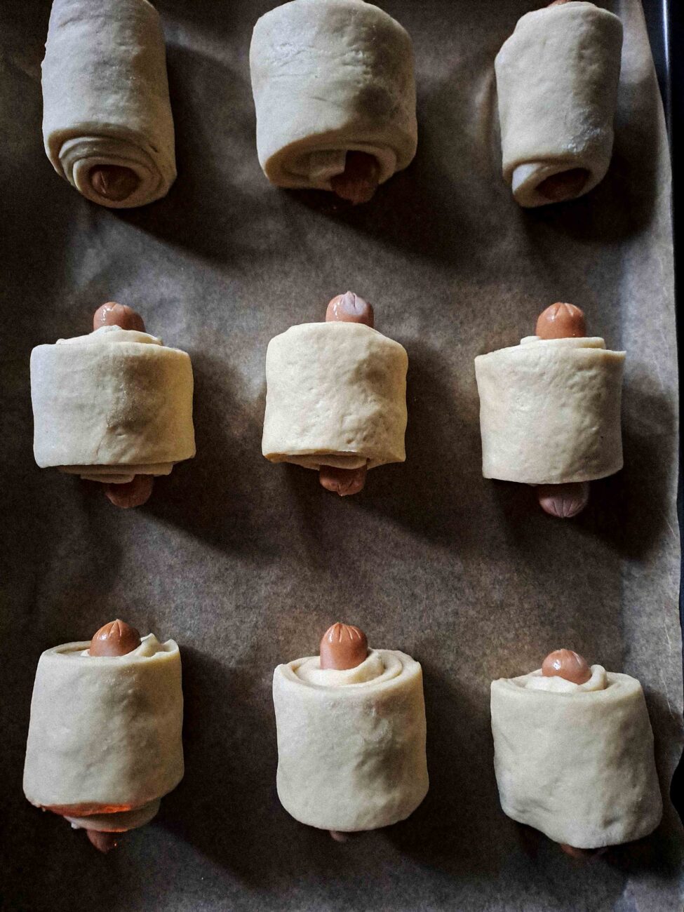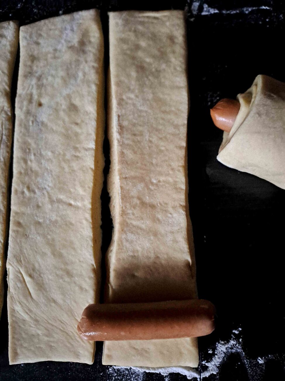 След втасване, прехвърлете тестото върху леко набрашнен плот и го разточете на правоъгълник с дължина около 60 см и ширина 15 см. Нарежете на 12 ленти, като във всяка лента поставите по един мини кренвирш и внимателно навийте. По желание, можете да направите три малки прореза отгоре за по-интересен вид.
