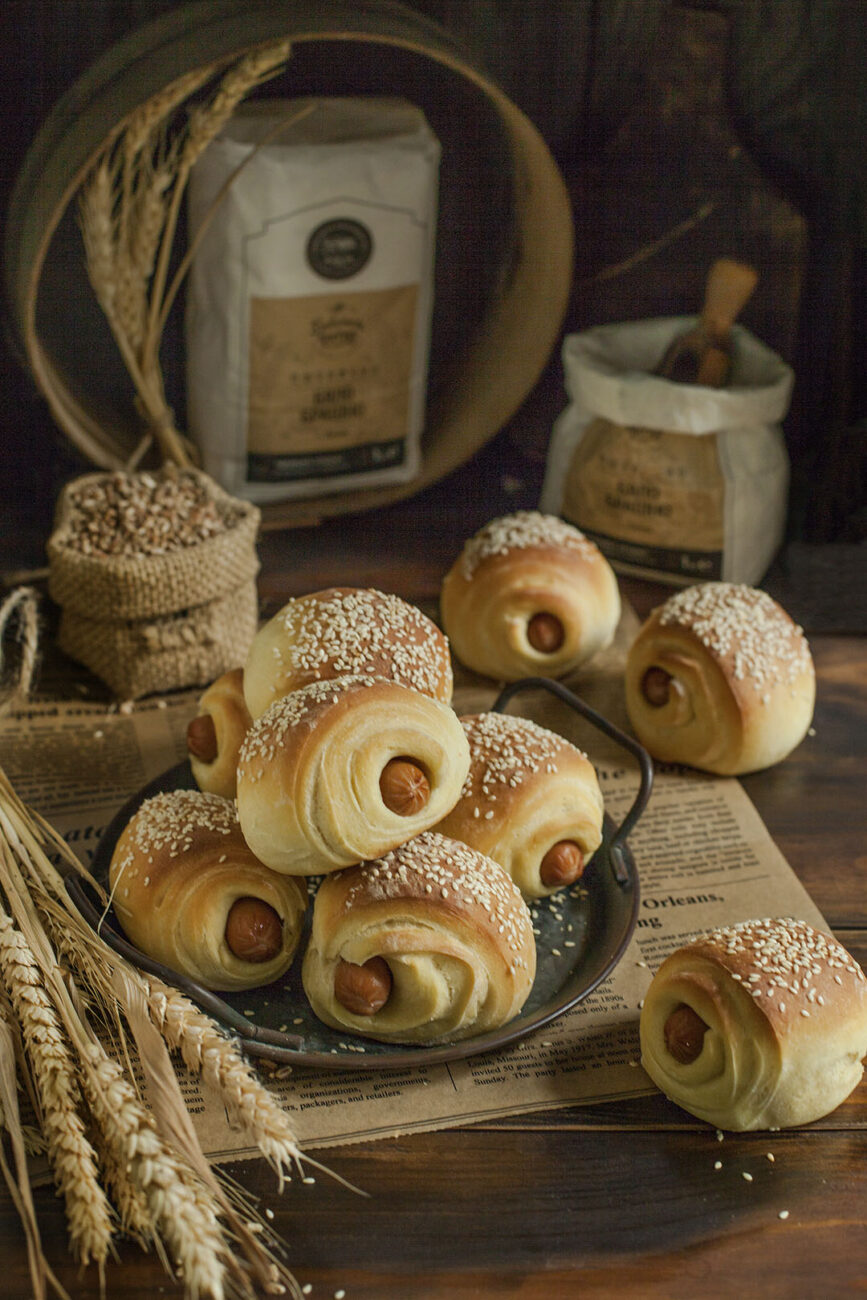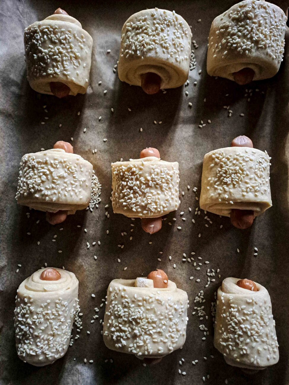 Подредете кренвиршките в тава, покрита с хартия за печене, и оставете да втасат отново за кратко. Загрейте фурната на 200°C, намажете кренвиршките с разбития жълтък и поръсете със сусам. Печете 18-20 минути или докато станат златисти и апетитни.