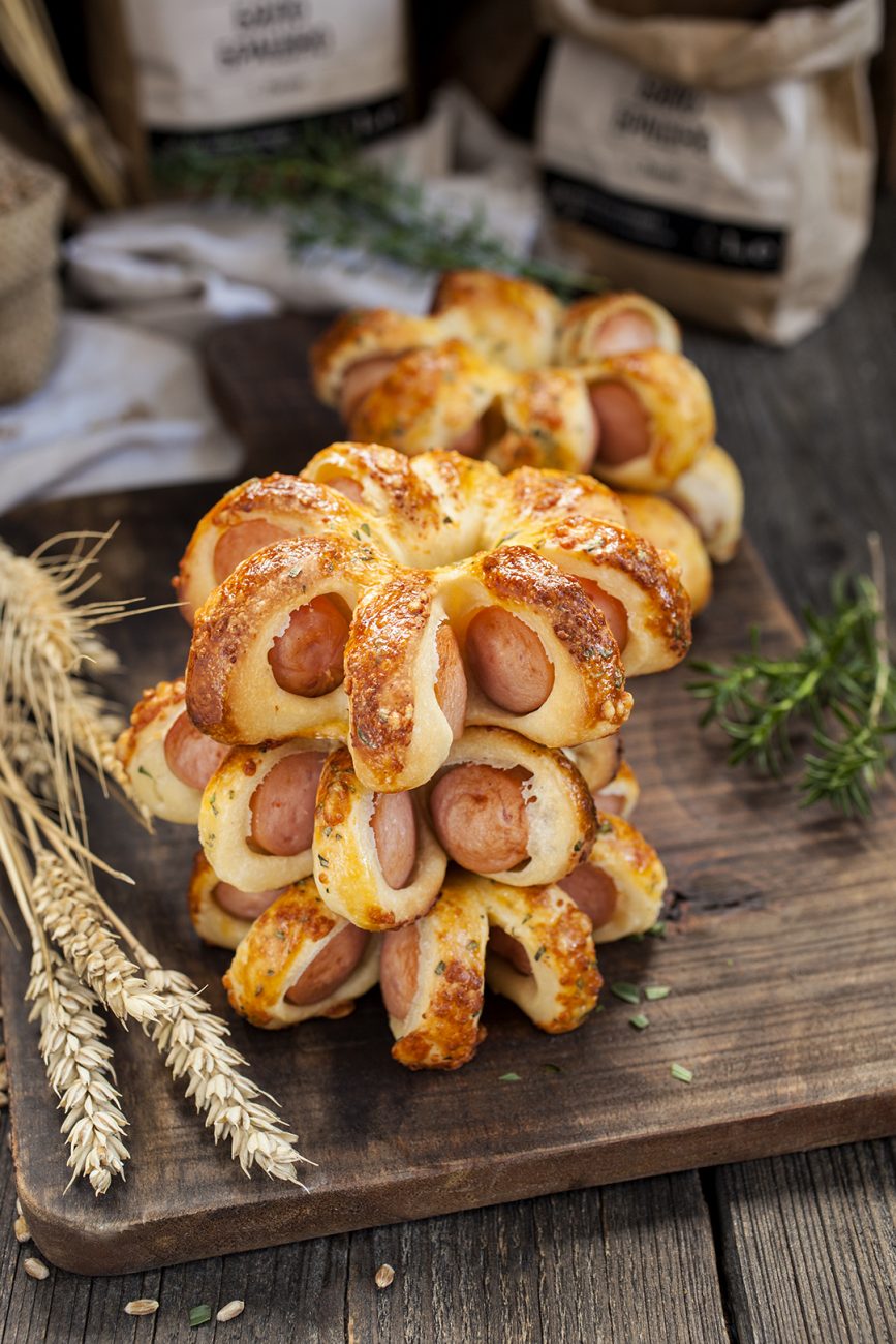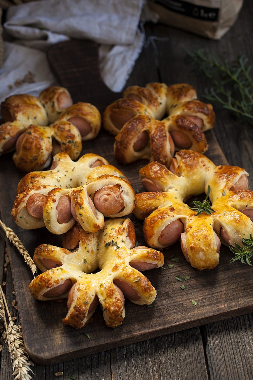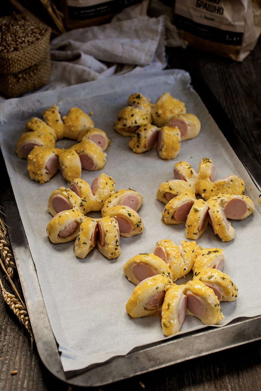 Ако искате да направите цвете, разточете всяка топка на правоъгълник, поръсете с пармезан и прясна подправка. Разточете до дебелина около 3 мм. Обърнете тестото така, че подправките да останат отдолу. Поставете кренвиршите по дължината на тестото, завийте и защипете краищата. Нарежете на разстояние от 1.5-2 см, като внимавате да не разрежете тестото до края. Сгънете в кръг, за да оформите цветето. (Вижте снимките за повече яснота.)