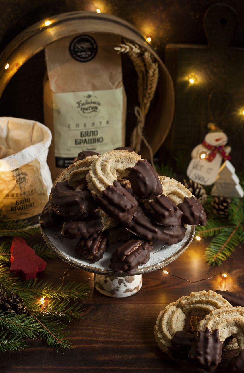 Охладете ги, докато фурната се загрее до 180°C, и печете сладките за 8-10 минути, докато краищата им станат леко розови. Охладете добре преди да ги потопите в разтопения на водна баня шоколадов кувертюр.