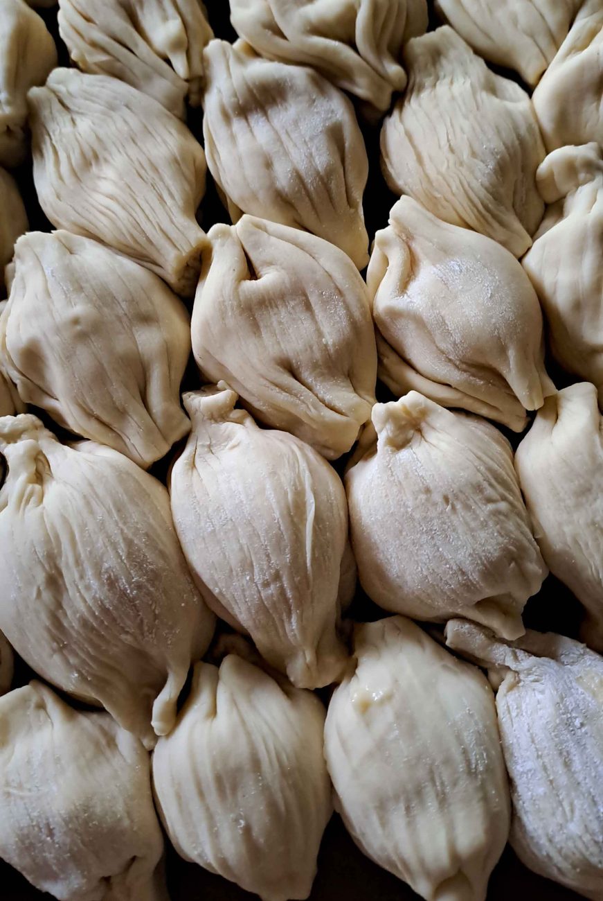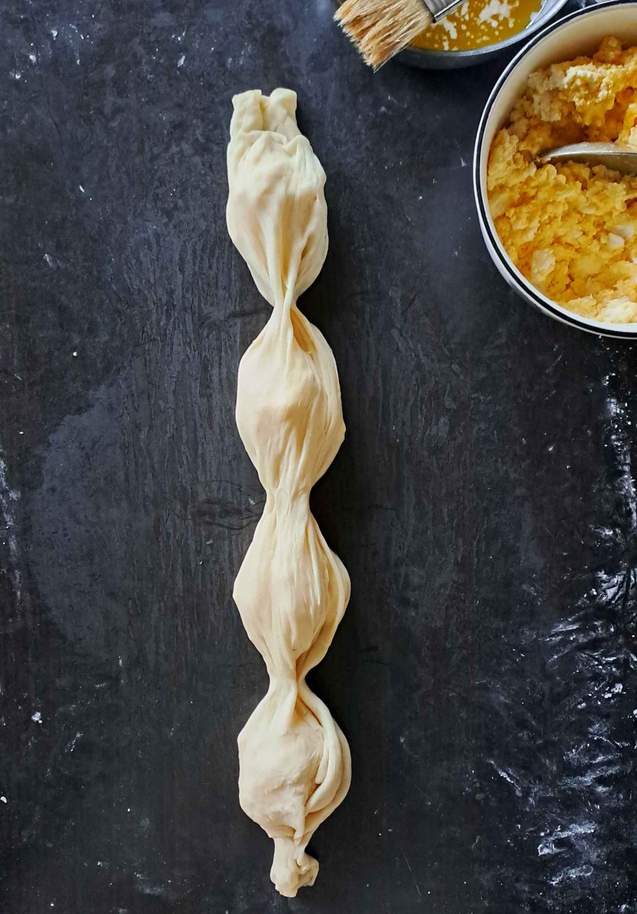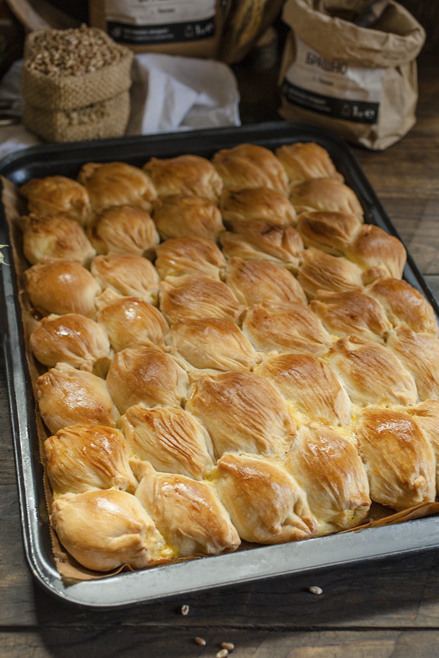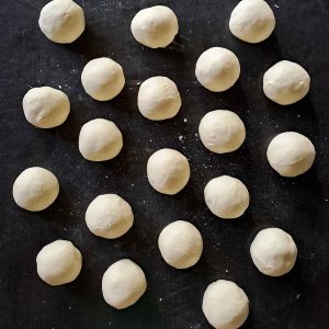 Измесете меко тесто от изброените продукти и го оставете настрана за 20 мин, след което го разделете на 20 къса- всеки къс оформете на топка.
