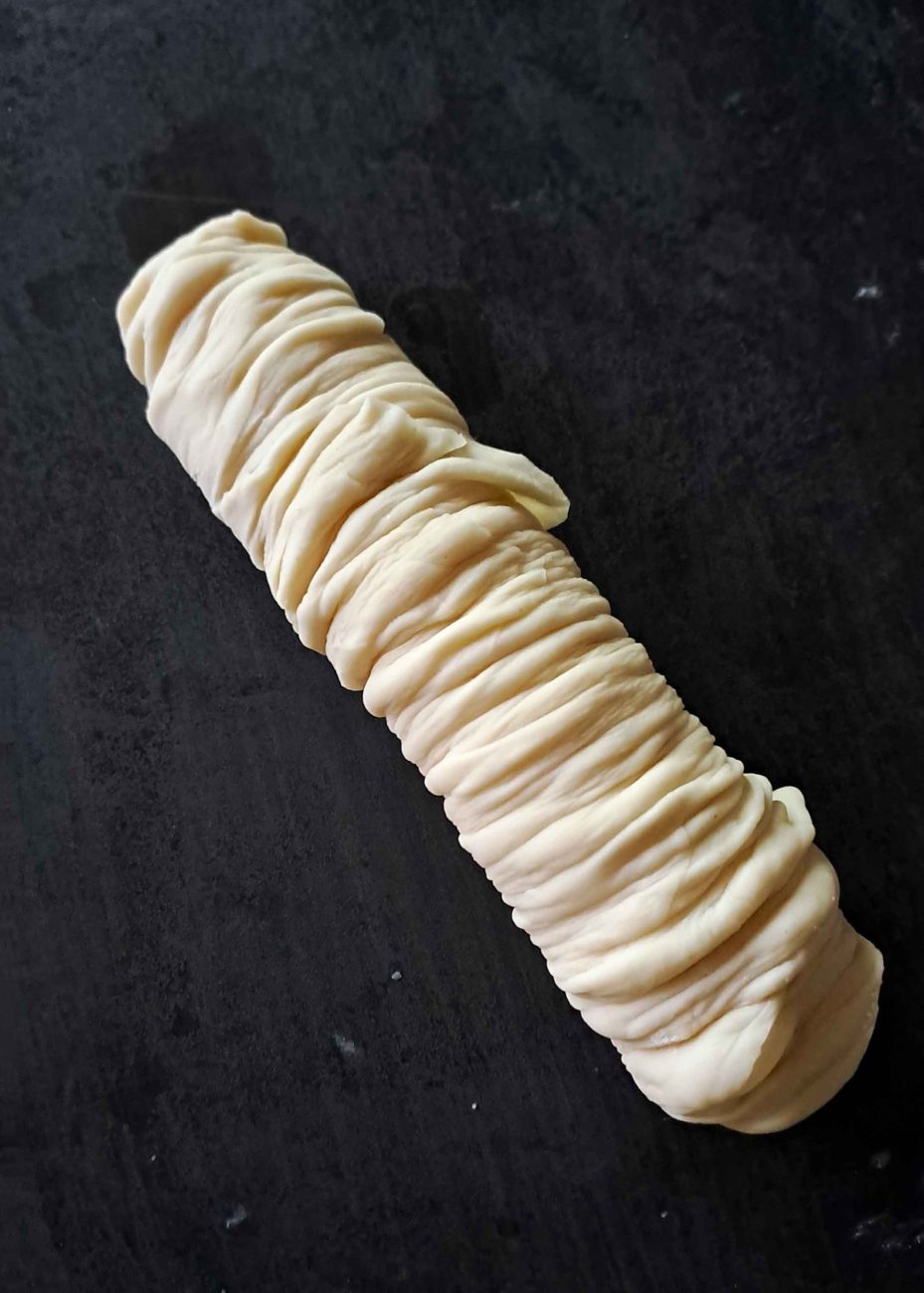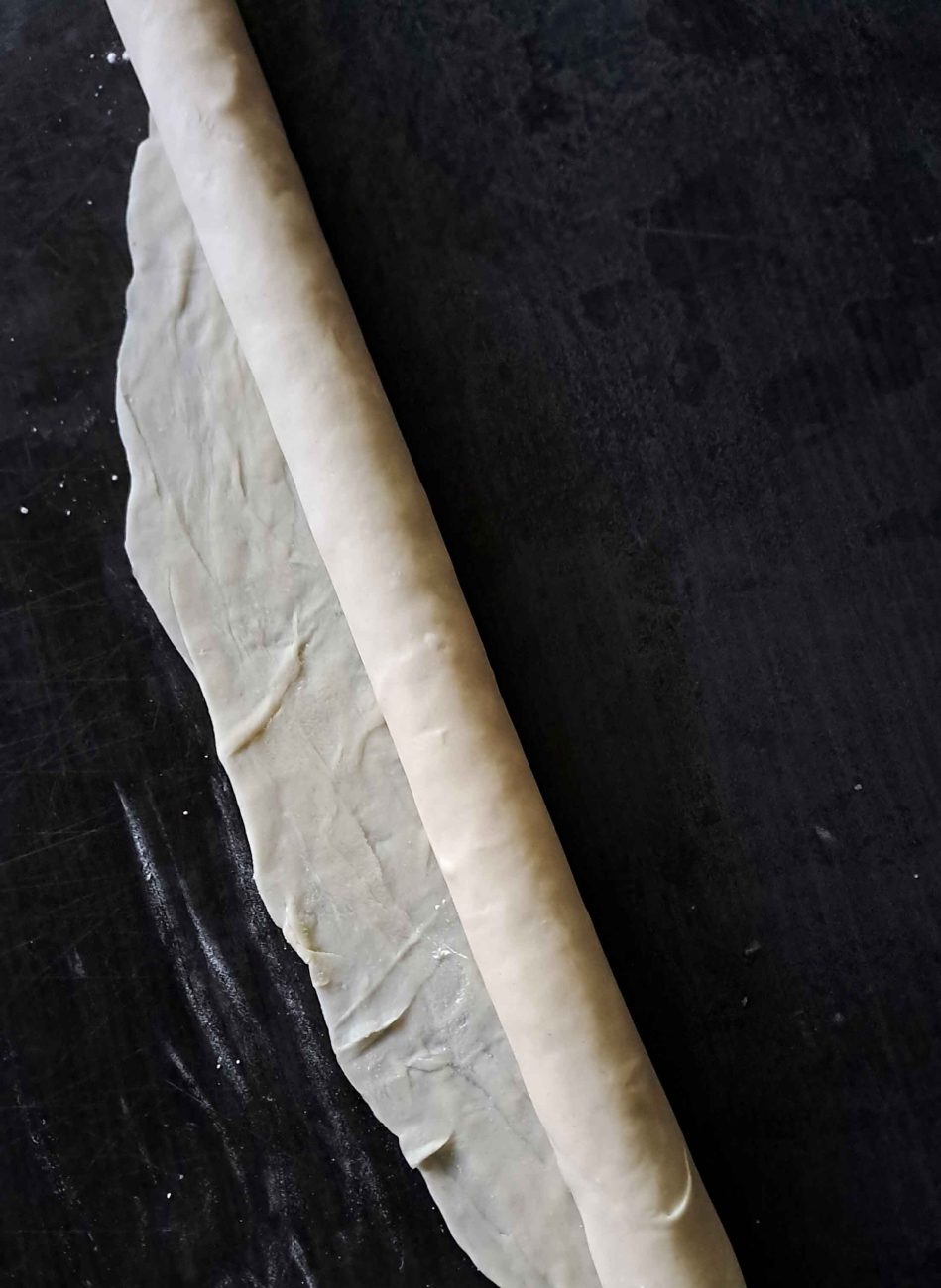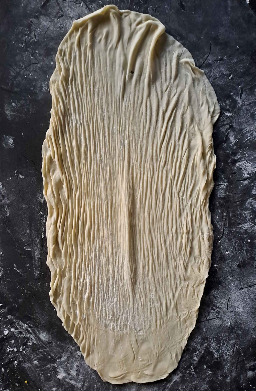 Вземете една топка и я разточете в кръг с диаметър 20 см, вземете втора топка и разточете и нея. Намажете първата с масло, поръсете с царевично нишесте, поставете другата върху нея и ги разточете възможно най-тънко.