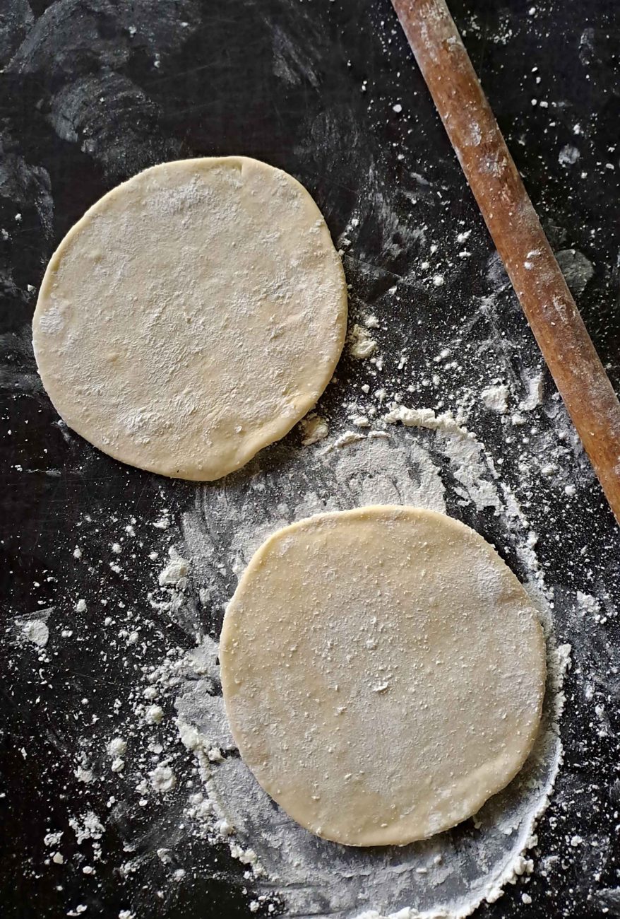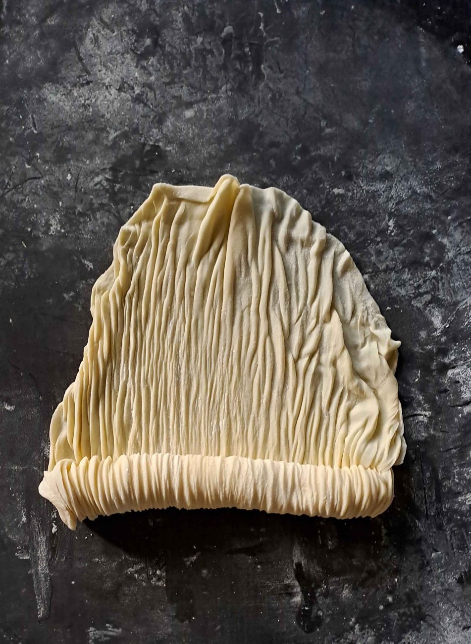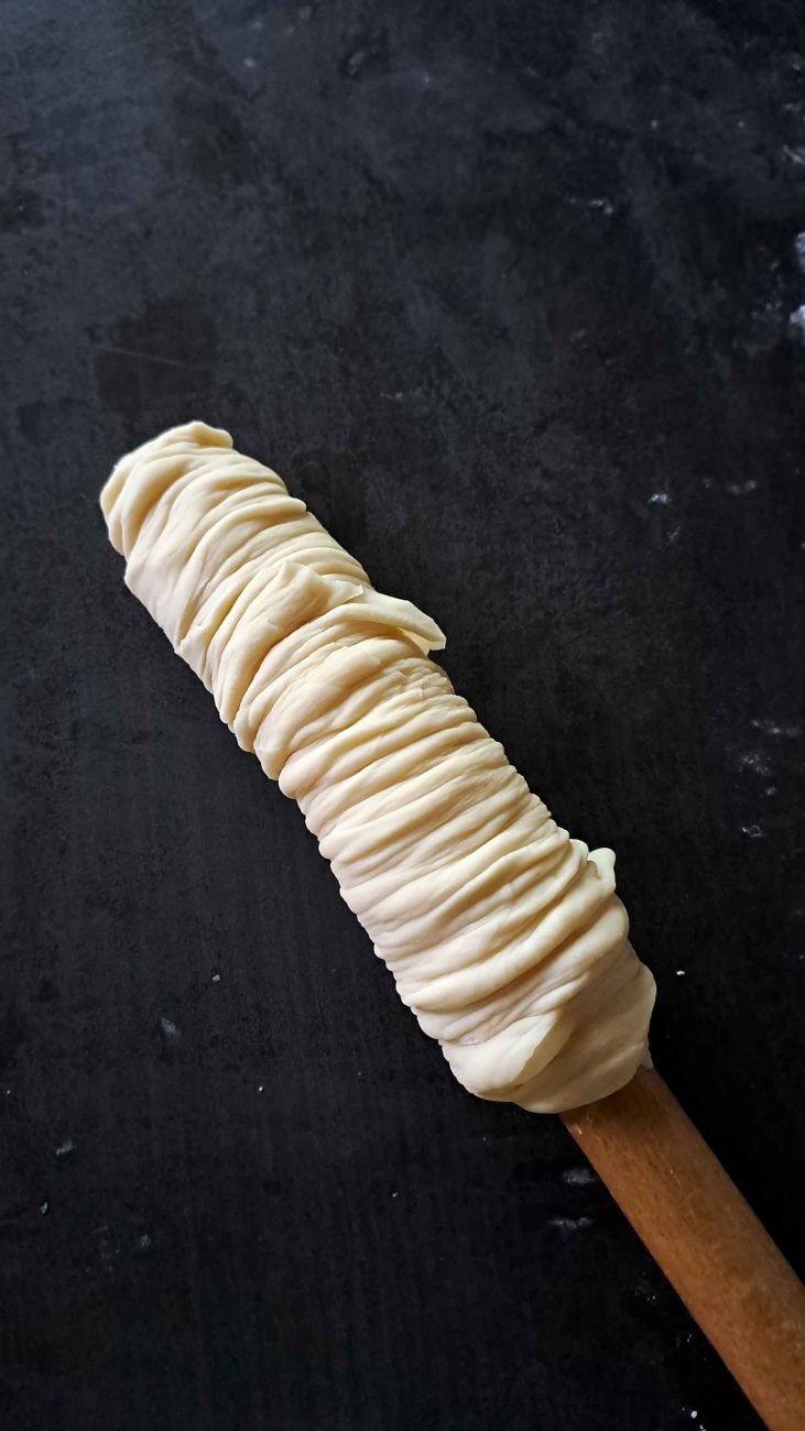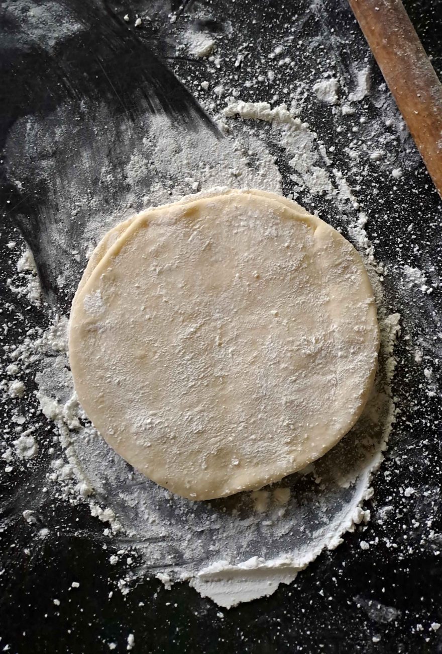 Вземете една топка и я разточете в кръг с диаметър 20 см, вземете втора топка и разточете и нея. Намажете първата с масло, поръсете с царевично нишесте, поставете другата върху нея и ги разточете възможно най-тънко.