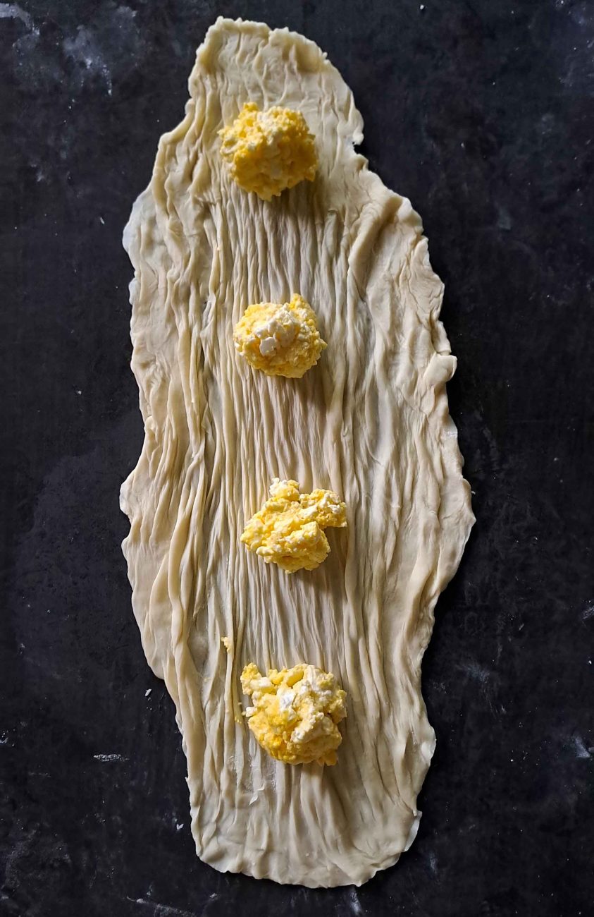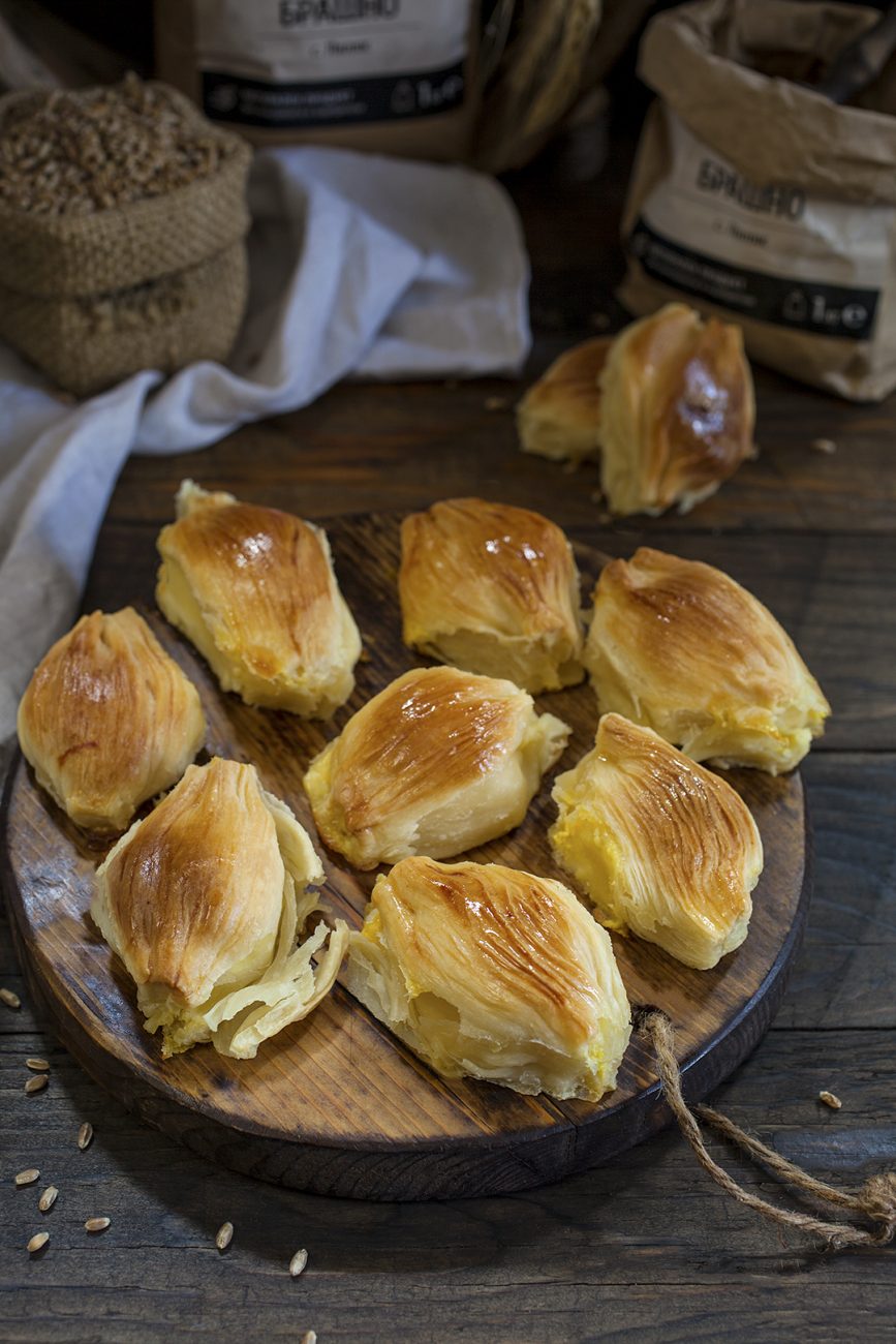 Нагънатата кора разбийте, намажете с масло, сложете от плънката, както е показано в снимките от оформянето, прегънете краищата, притиснете добре кората, където няма плънка, разрежете на малки късове и сложете в тававърху хартия за печене.