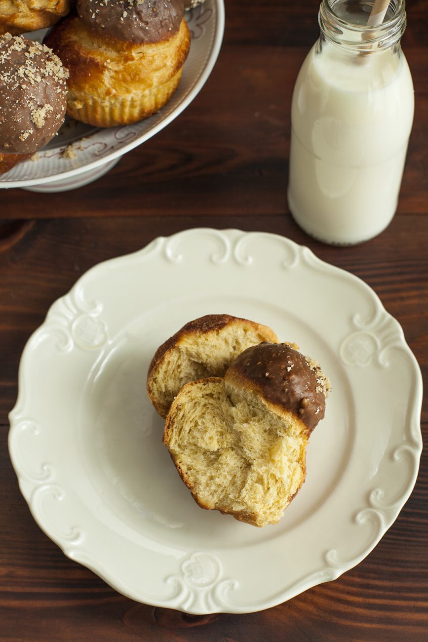 - Потопете всяка шапчица на бриошите в шоколада, поръсете със смлени ядки по желание, и оставете настрана, докато шоколадът стегне.