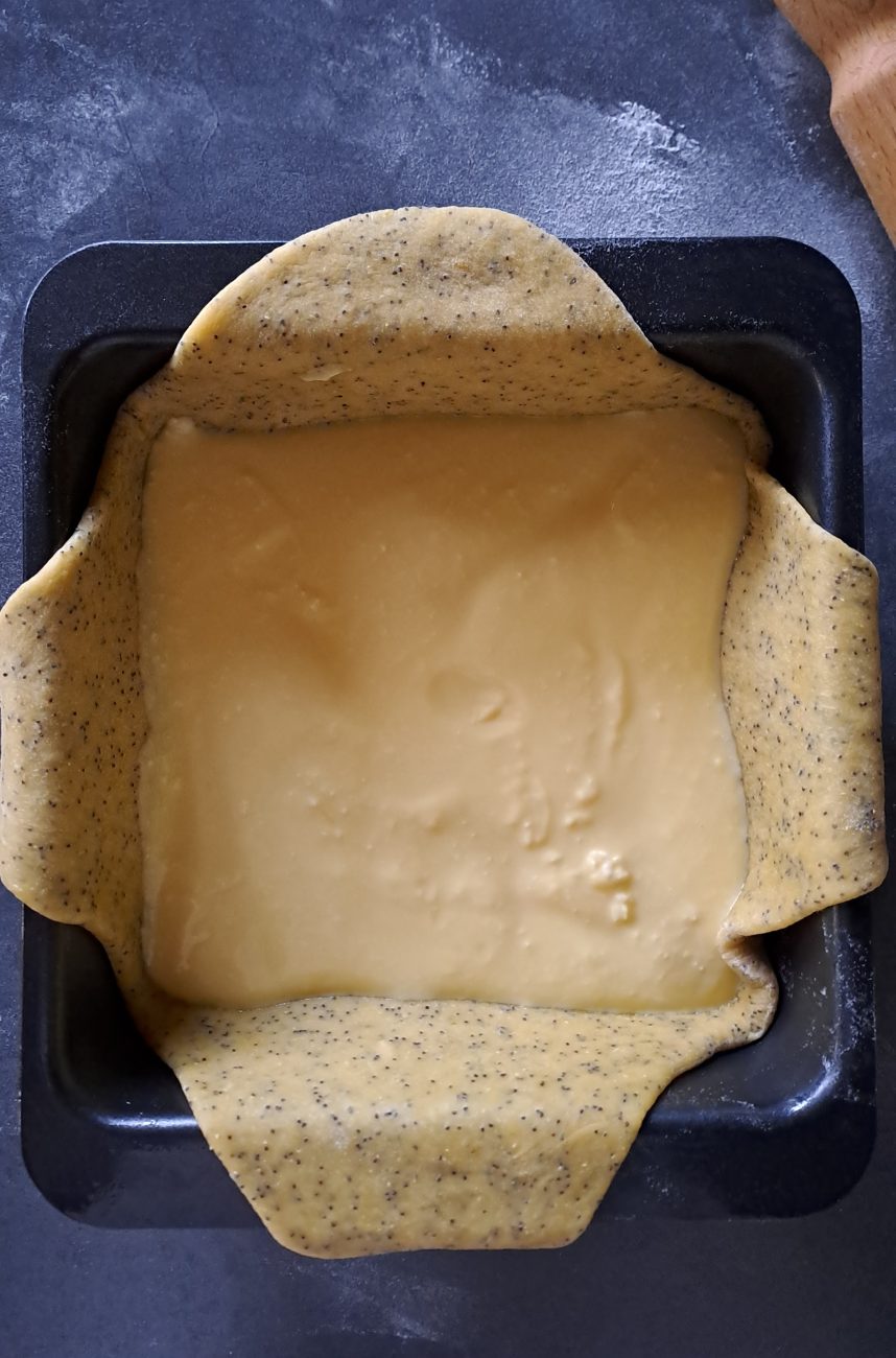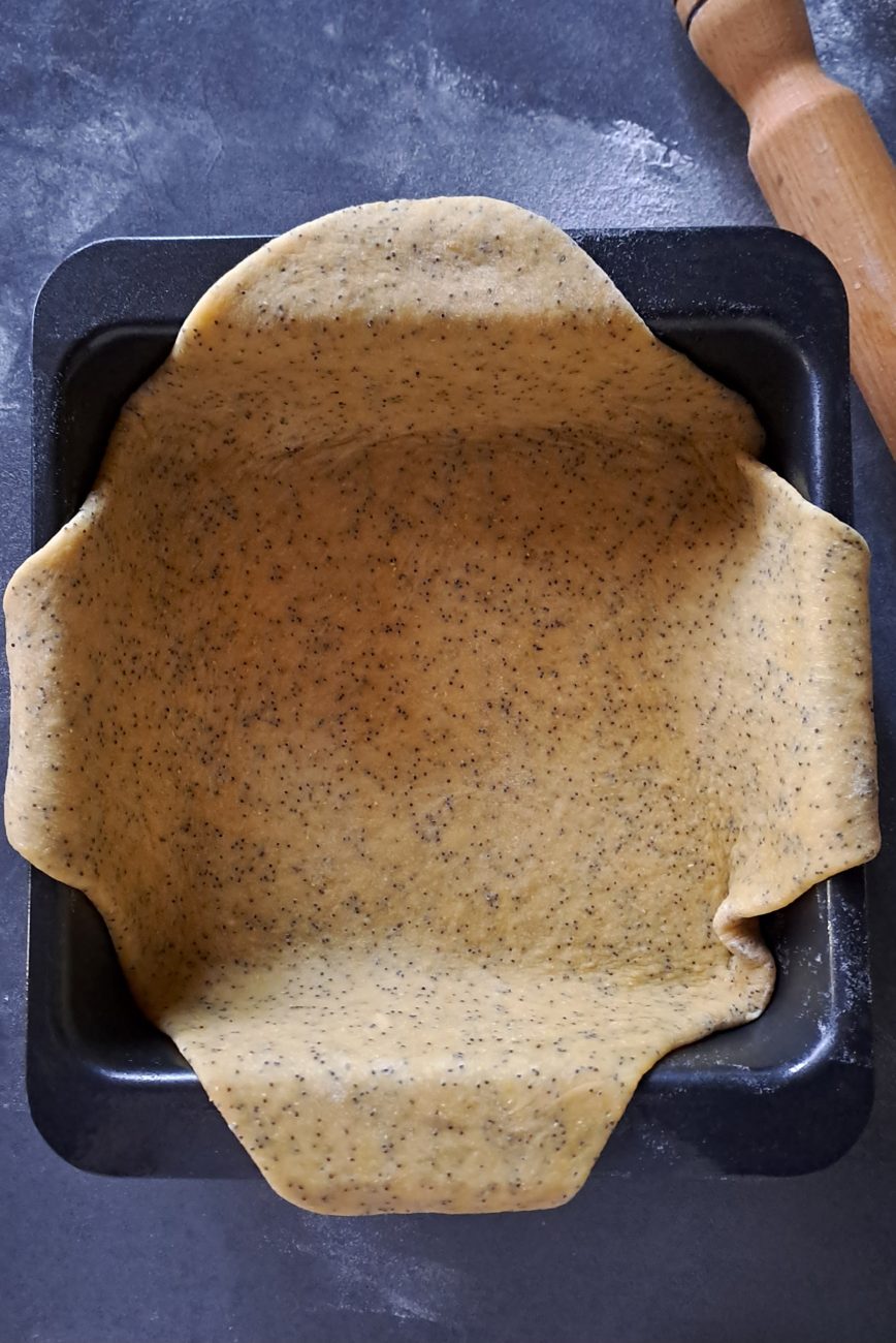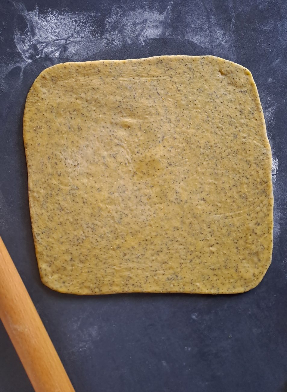 Когато тестото втаса, включете фурната на 180С, изсипете го върху леко набрашнен плот и разточете в квадратна форма с размери около 30х30 см.