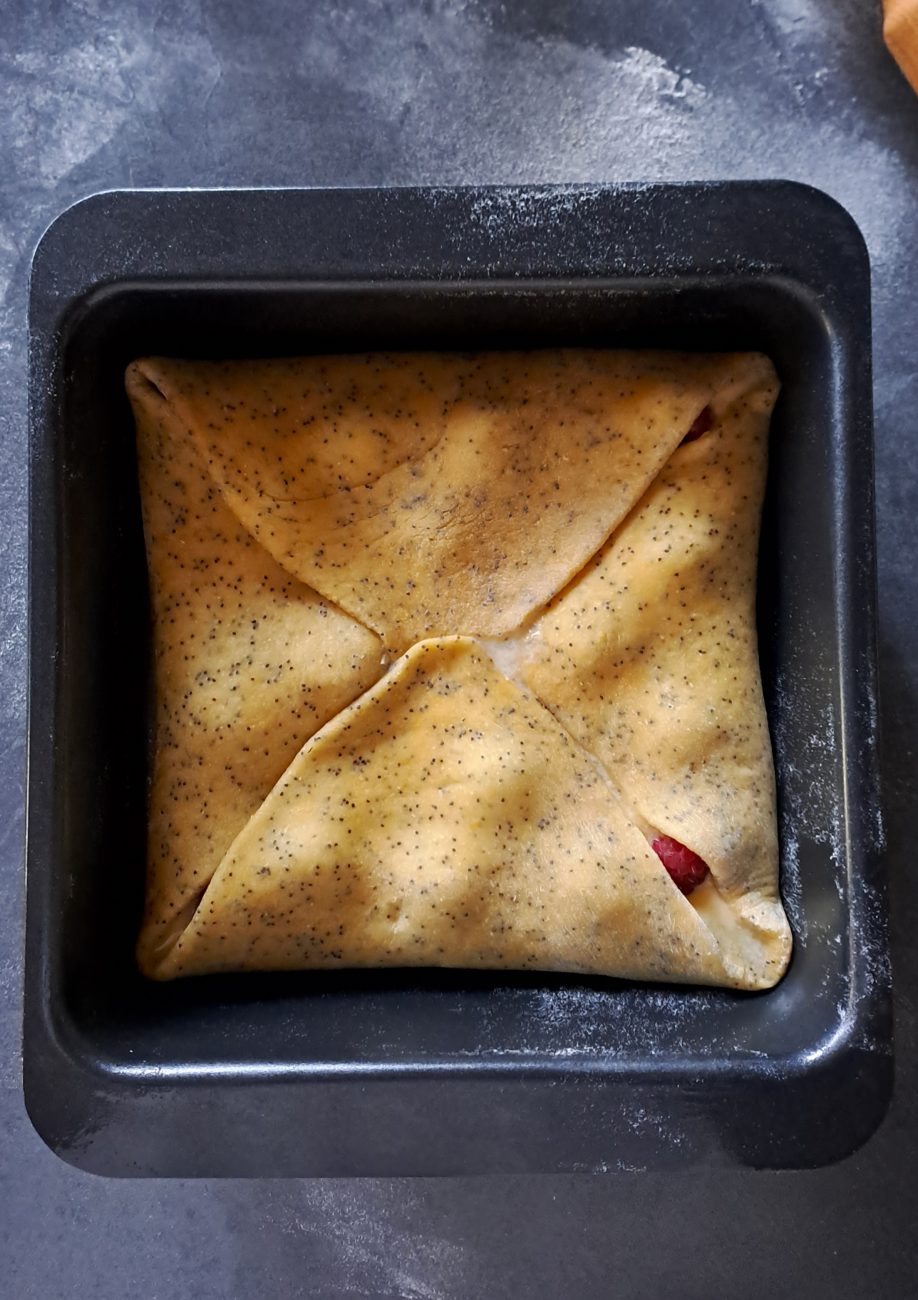 Замесете тесто от изброените продукти. Покрийте го и оставете да втаса до удвояване на обема. През това време направете пълнежа като разбъркате добре рикотата със яйцето, захарта и лимоновия сок. Оставете в хладилника до момента на ползване.