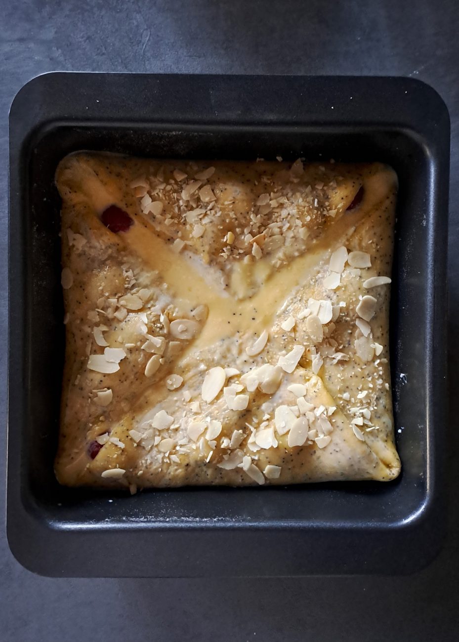 Намажете с прясно мляко, поръсете отгоре с филирани бадеми и изпечете за около 40 мин или до желания загар. Охладете добре върху решетка.