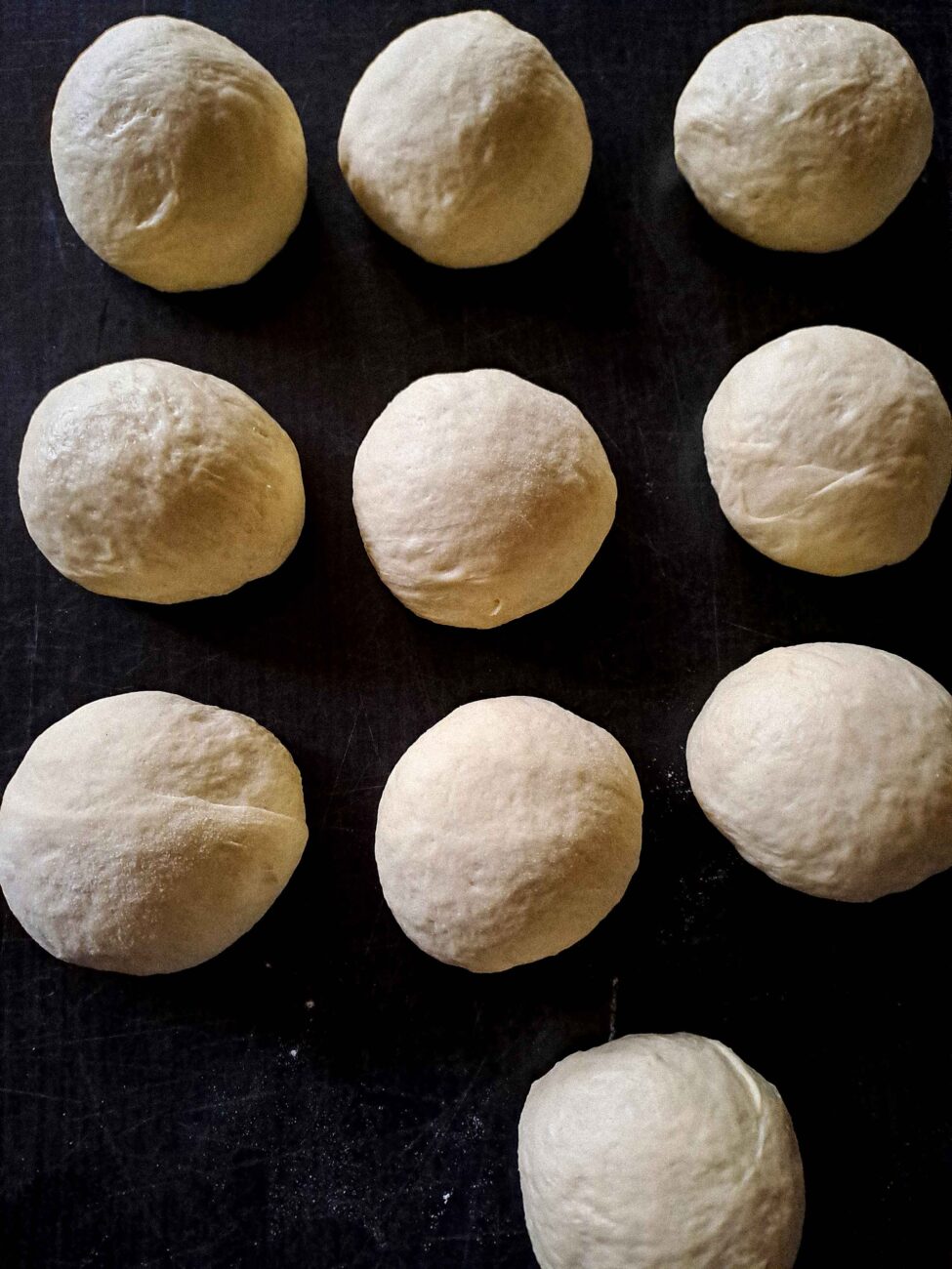 В купата на миксера смесете брашната, млякото, яйцето, олиото и кваса. Включете на ниска скорост, докато съставките се смесят добре, след което изключете миксера. След кратка почивка от 20-30 минути, включете отново и добавете солта. Месете, докато тестото се отлепи от стените на купата. Прехвърлете го в намазнена купа, покрийте и оставете да почива за 1 час. След това направете две вътрешни сгъвания на тестото и го оставете да втаса до удвояване на обема си. Ако замесвате тестото около обяд, може да го приберете при нарастване с 30-40%.
