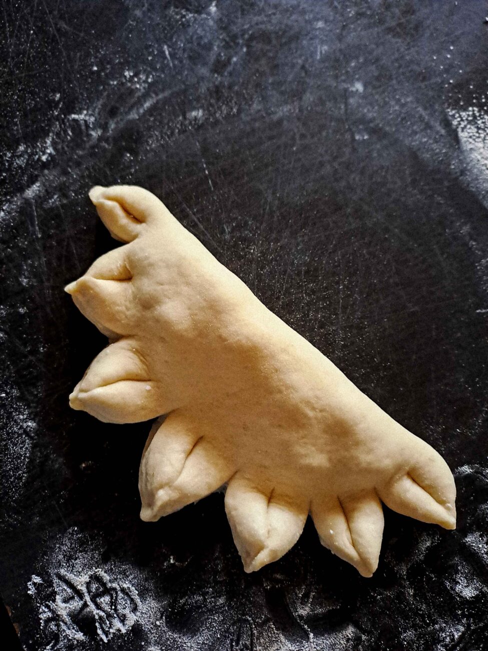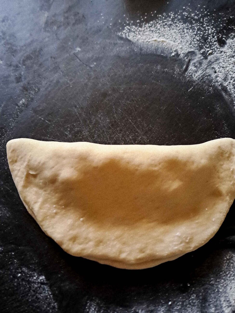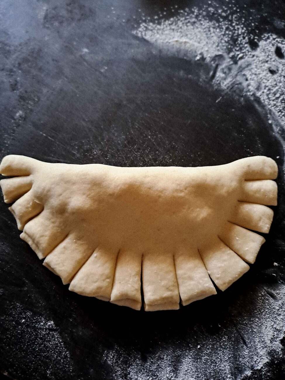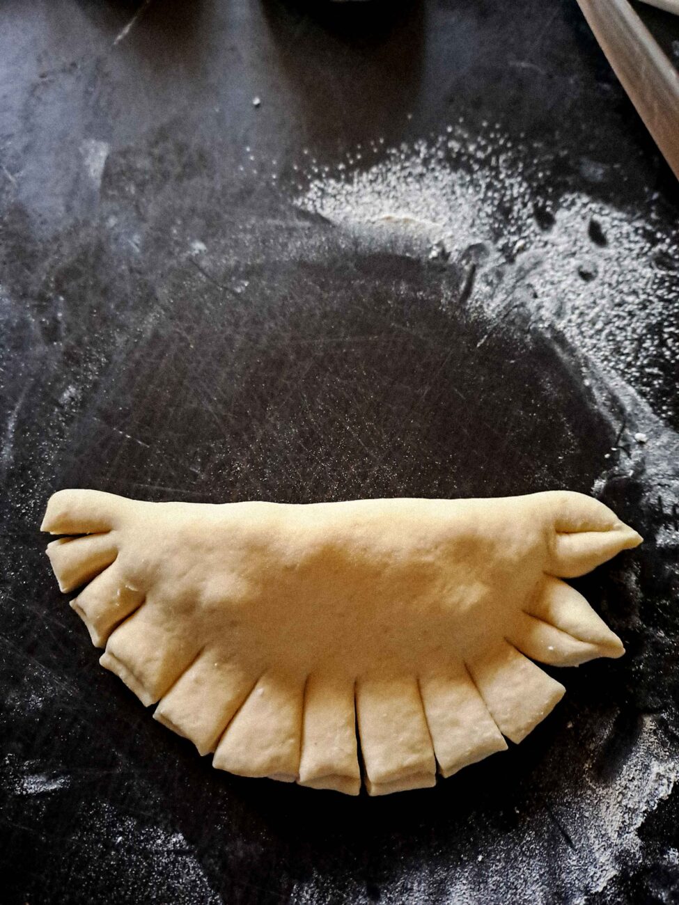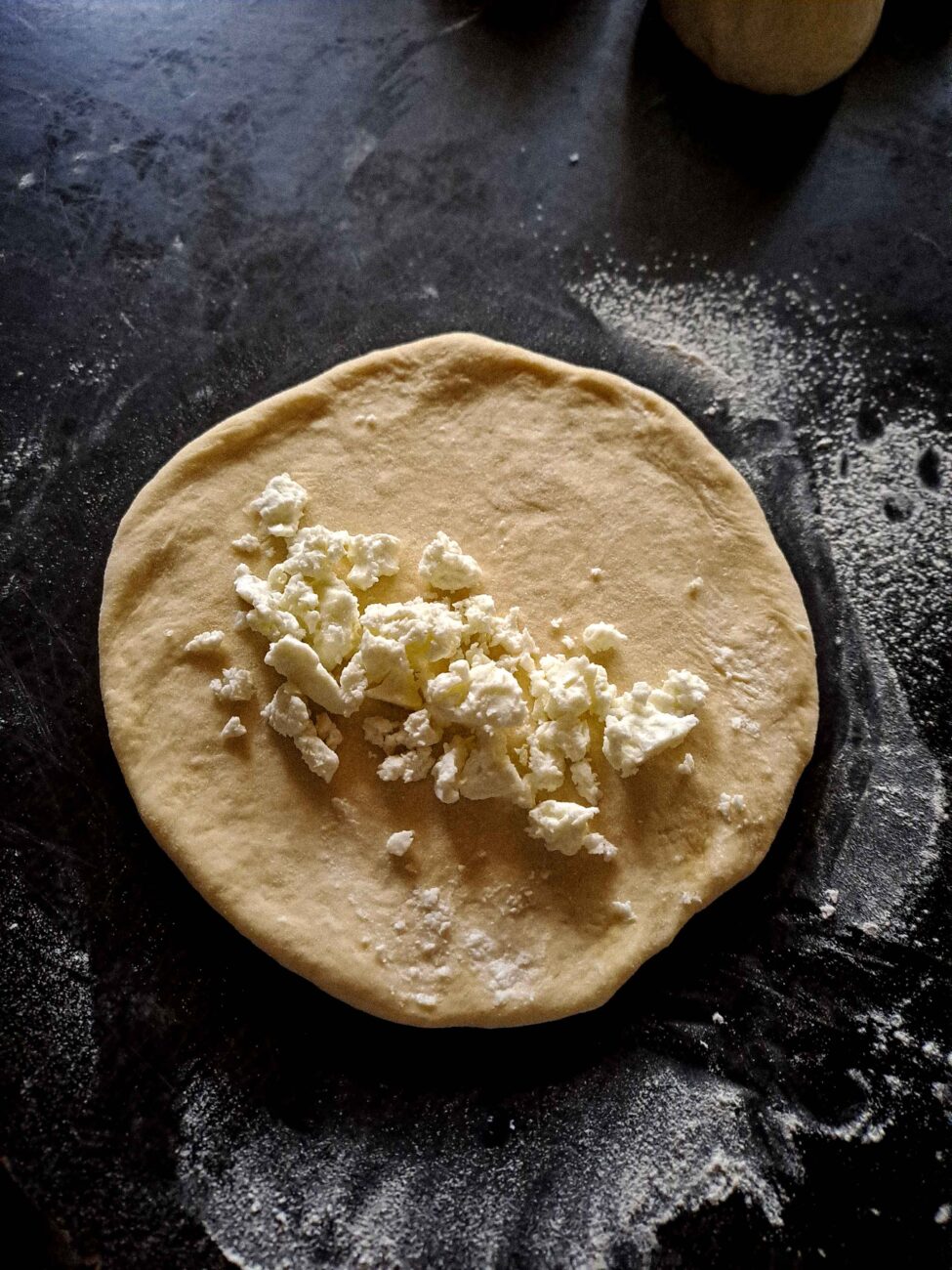Когато тестото е готово за оформяне, разделете го на 9-10 равни части и формирайте топки. Покрийте ги и оставете да почиват 20 минути. След това всяка топка разточете в кръг с диаметър около 13-15 см. На единия край на кръга поставете натрошеното сирене, сгънете на половина и направете разрези с дължина 2 см на разстояние около 1 см. Съединете две лентички и прищипете края. Прехвърлете оформените питки в тава, покрита с хартия за печене, и оставете да втасат отново за 1.30-2 часа, или според околната температура.