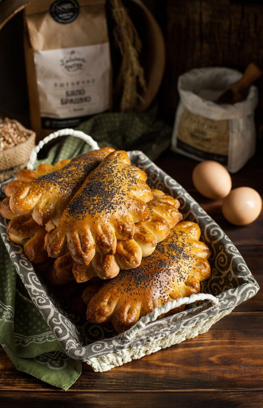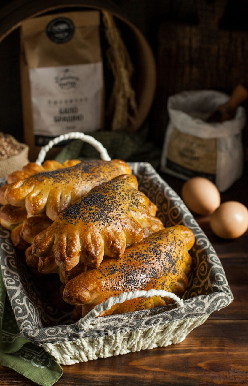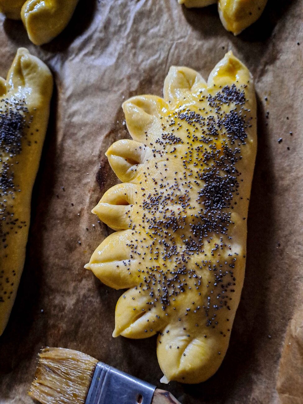 Когато “цветчетата” са нарастнали, загрейте фурната на 190°C. Намажете питките с разбит жълтък/яйце и поръсете с маково семе. Изпечете за 20-25 минути или докато придобият желания загар. Извадете ги от фурната и оставете да се охладят за кратко преди сервиране.