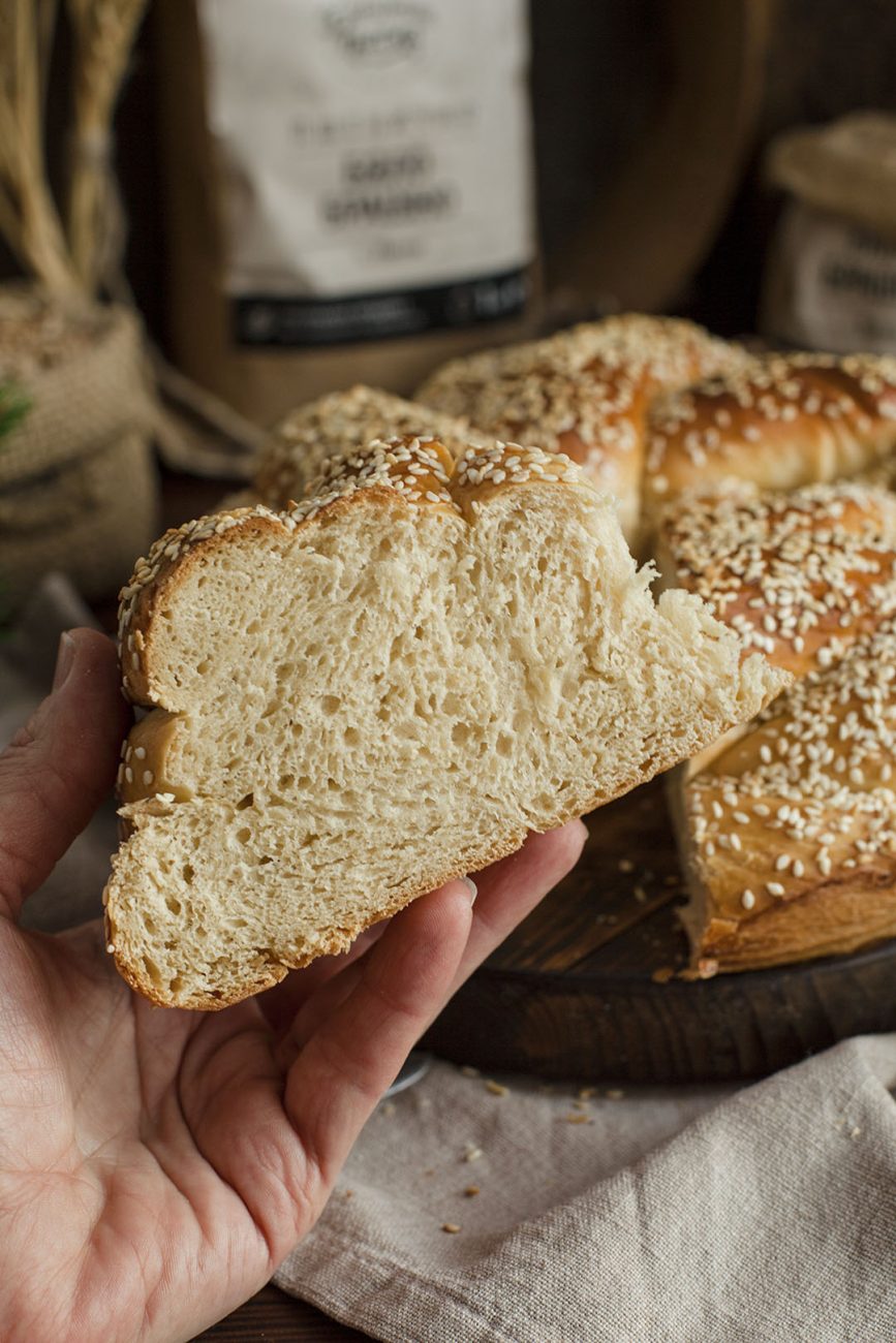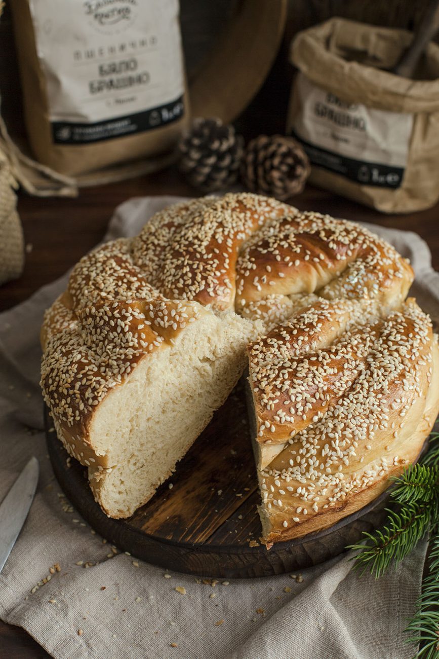 Когато питката втаса, включете фурната да загрее на 200°C, намажете с разбит жълтък и поръсете със сусам. Изпечете за 30-35 минути или до желаната загар. Охладете върху решетка и сервирайте с любимите ястия.