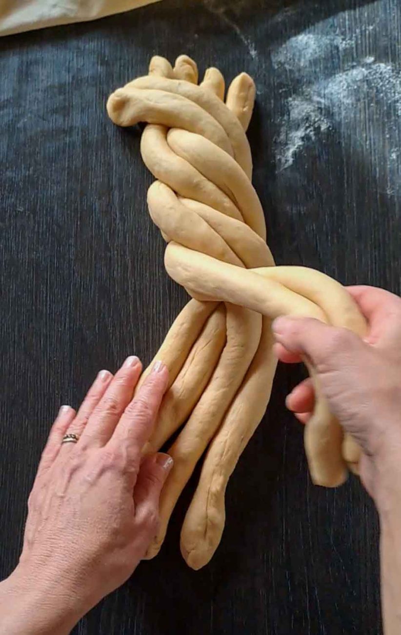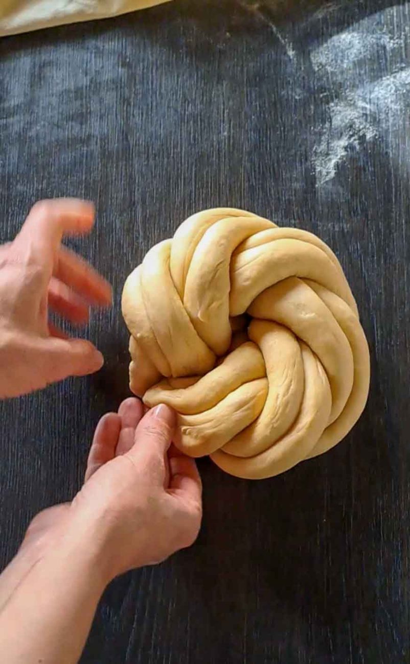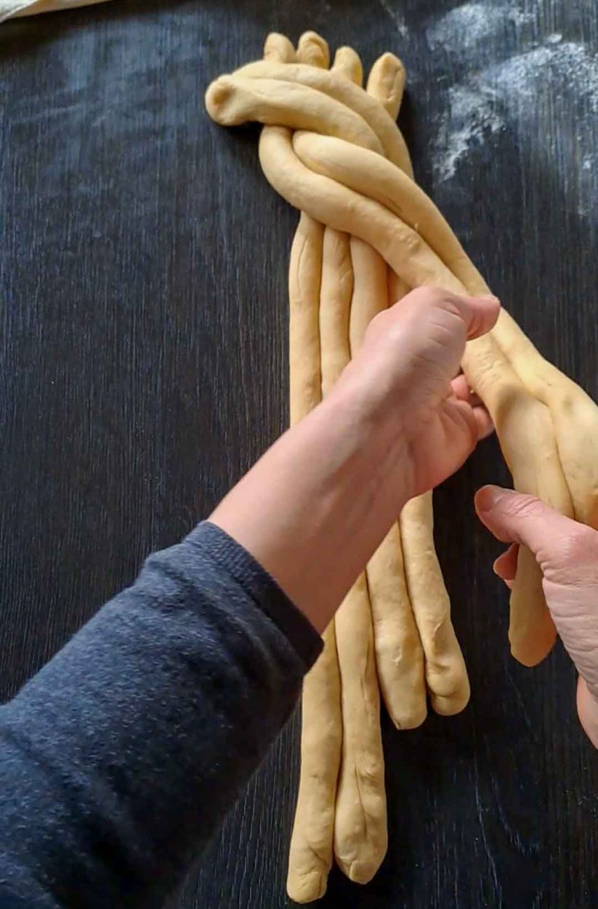Наредете ги един до друг и прехвърлете една двойка отляво в най-дясно, след това следващата двойка и така докато преплетете всички (вижте снимките за оформянето).