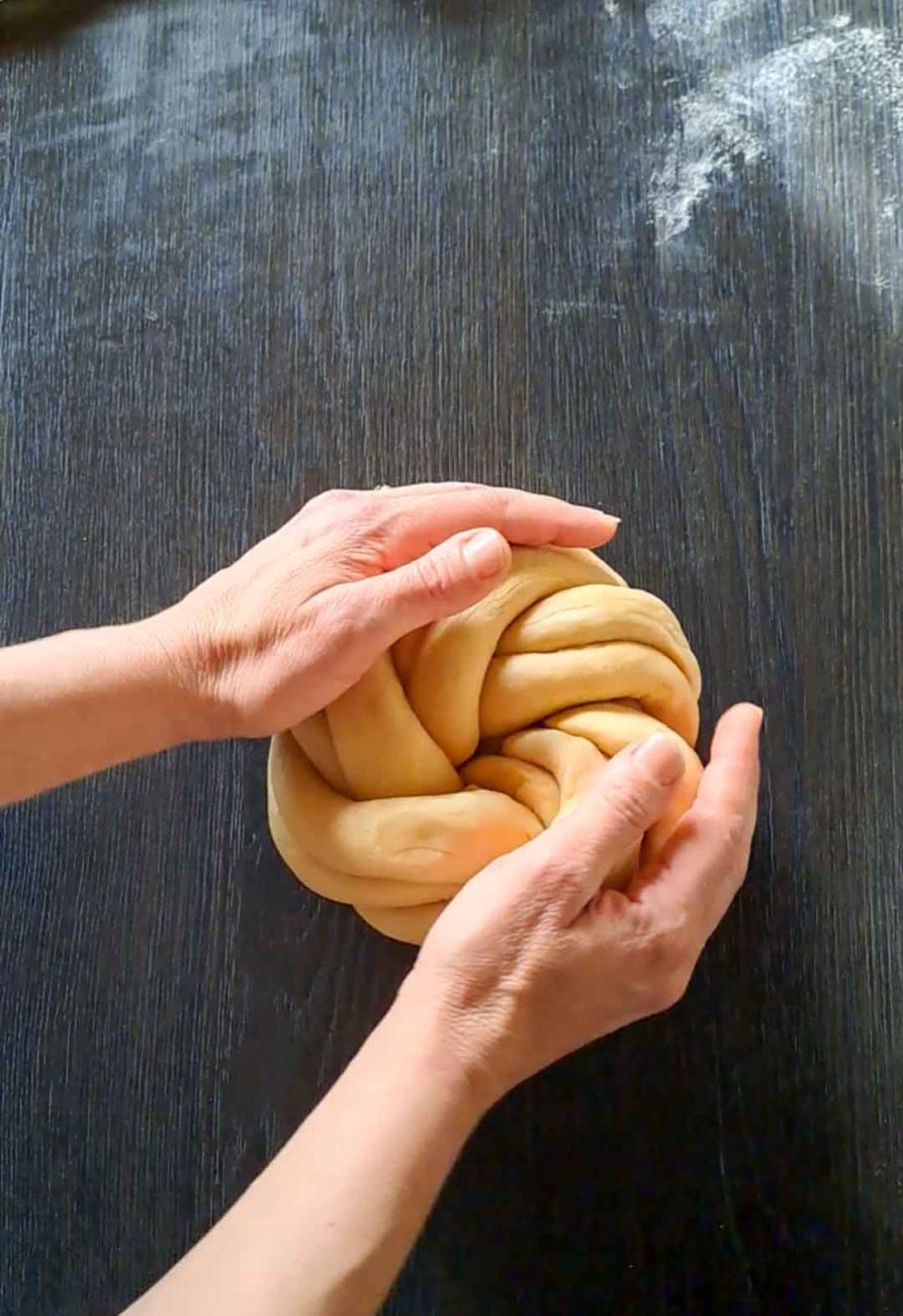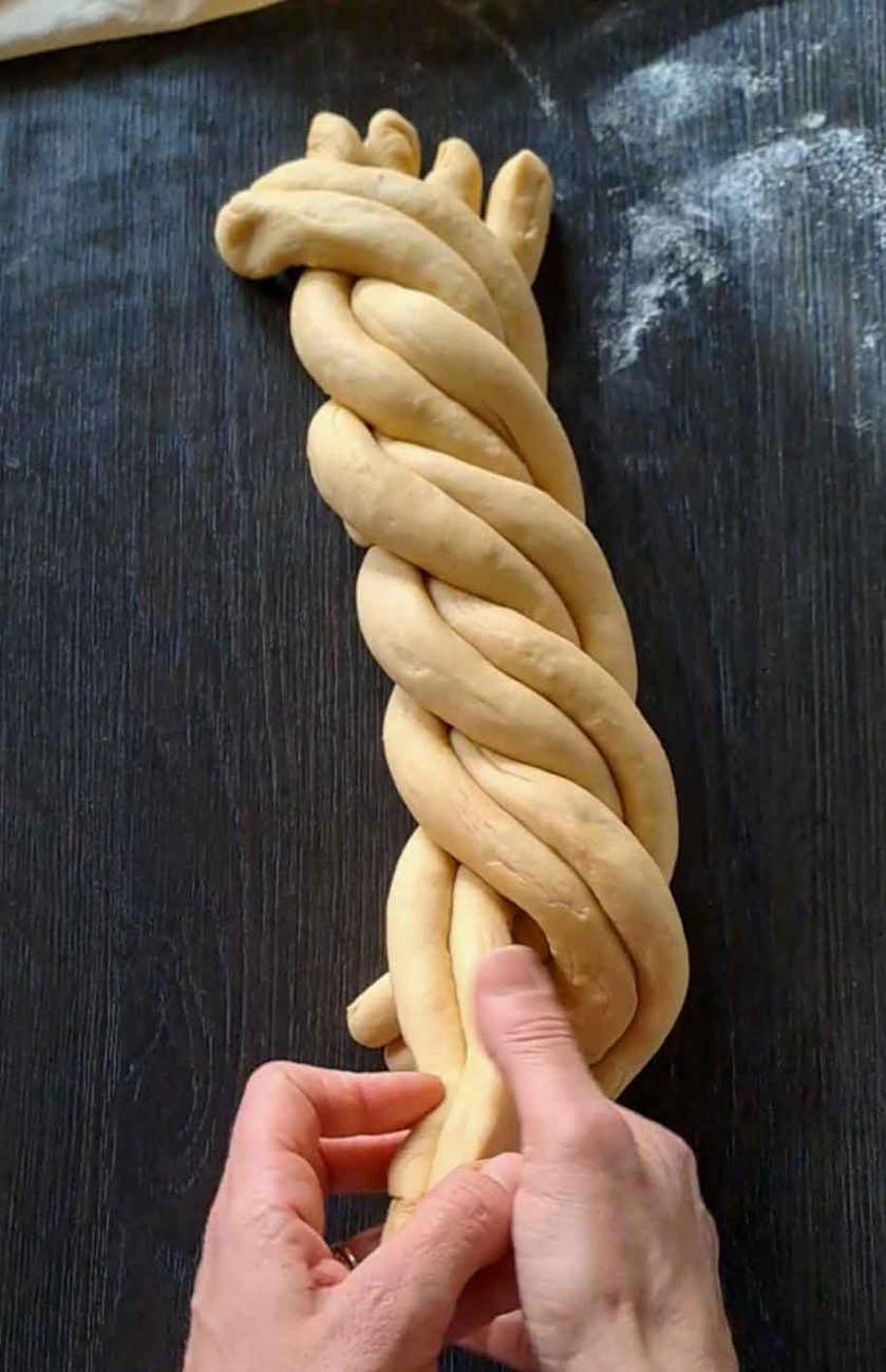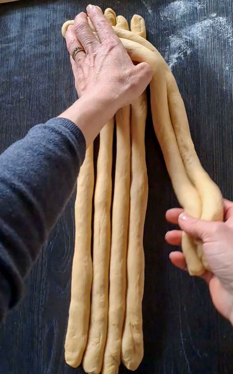 Наредете ги един до друг и прехвърлете една двойка отляво в най-дясно, след това следващата двойка и така докато преплетете всички (вижте снимките за оформянето).