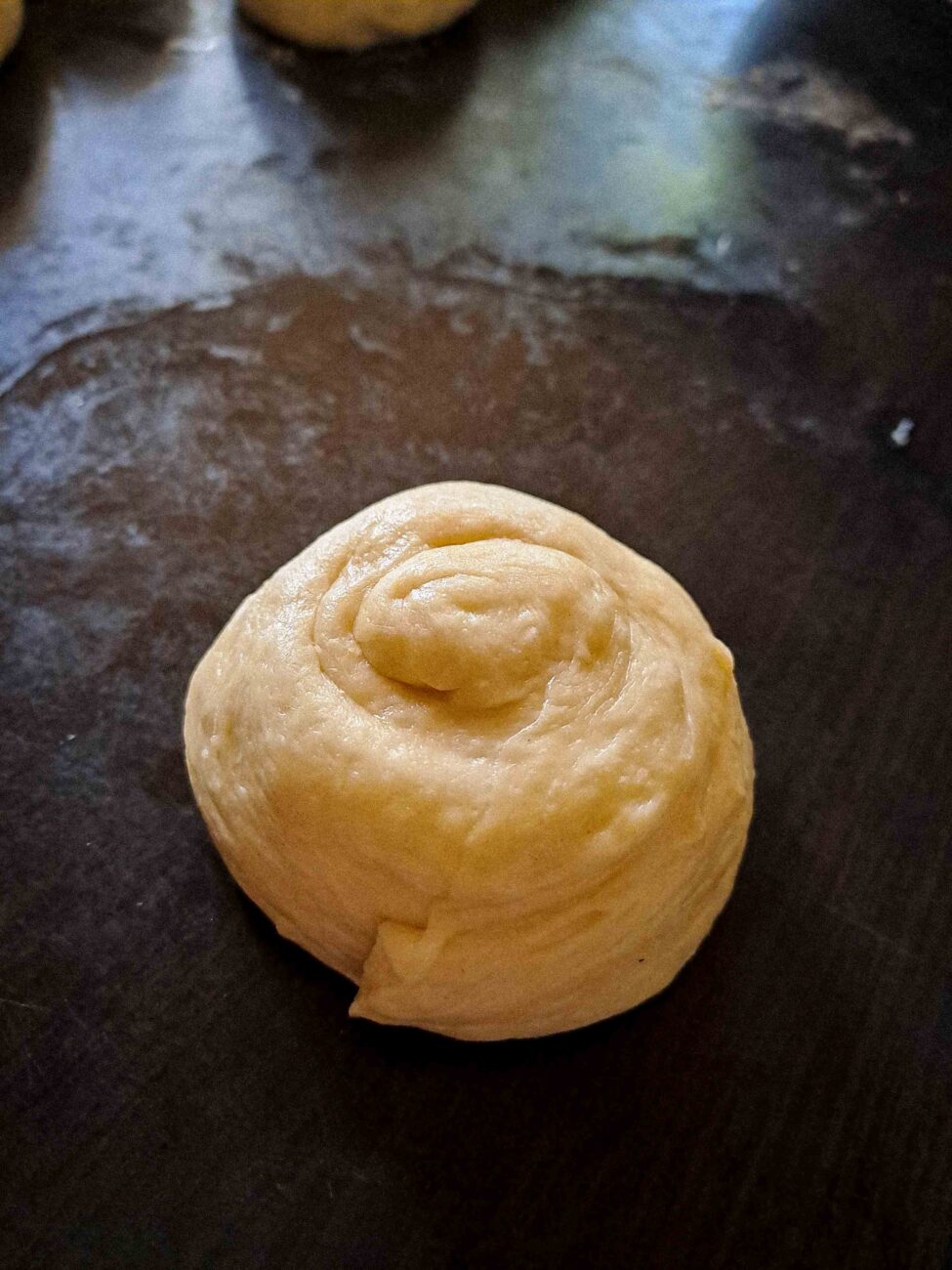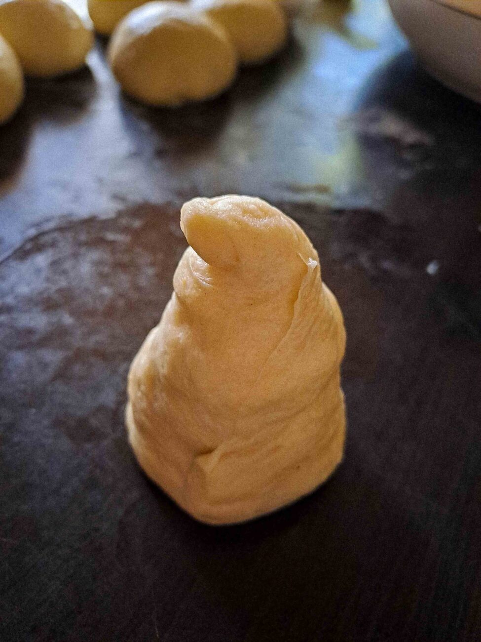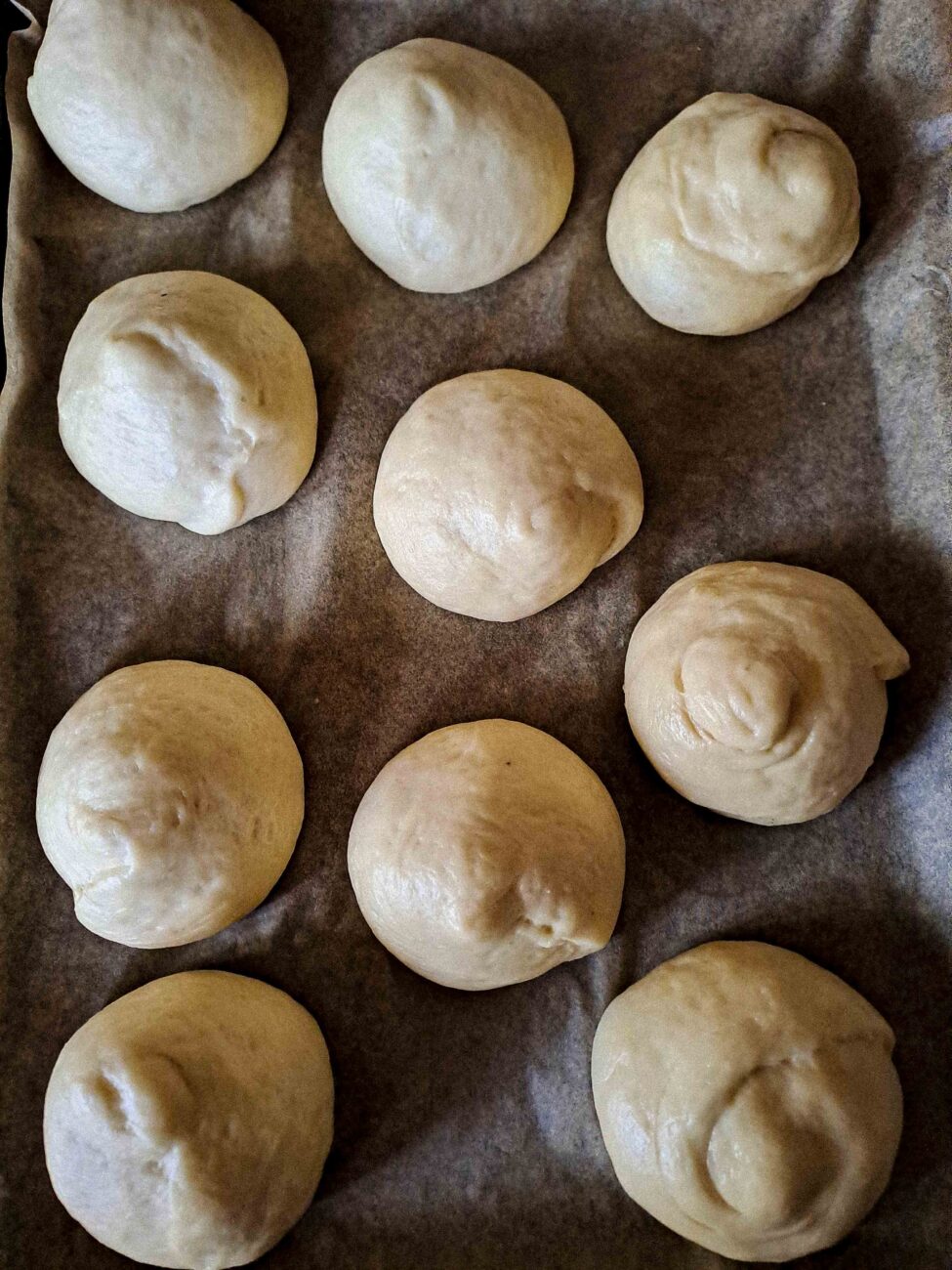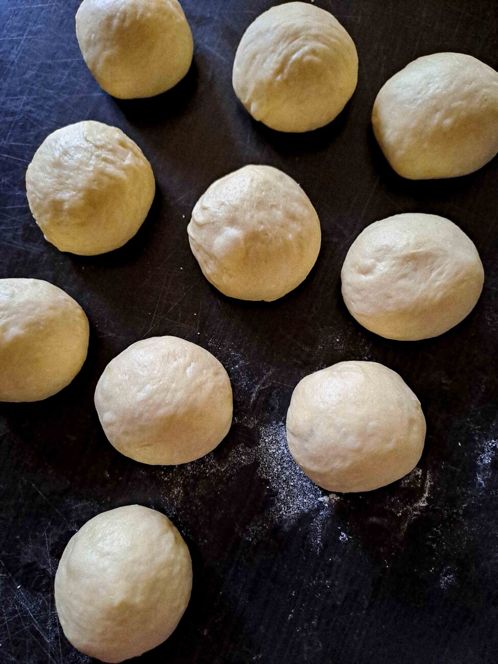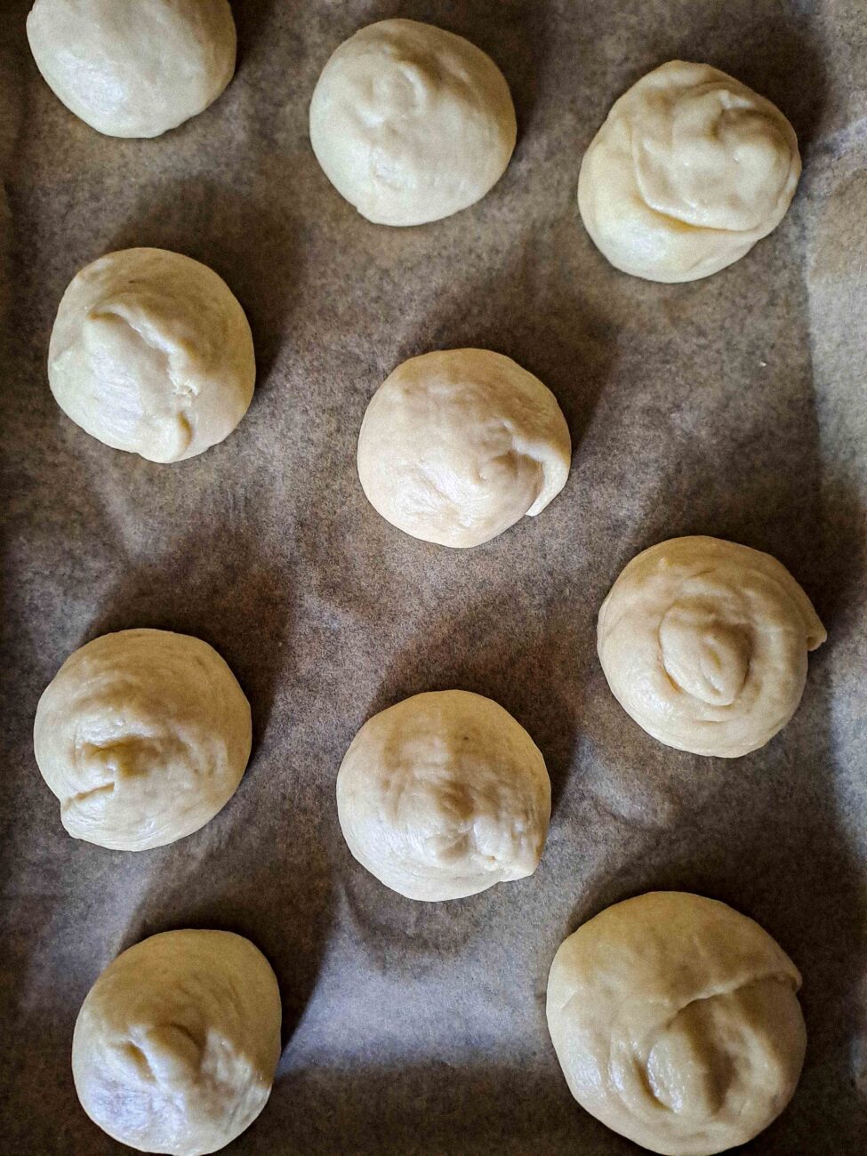 След като тестото е удвоило обема си, прехвърлете го върху леко намазнена работна повърхност. Разделете тестото на 10 равни части и от всяка оформете малка топка. Покрийте ги с фолио или кърпа и оставете за 10 минути, за да починат.